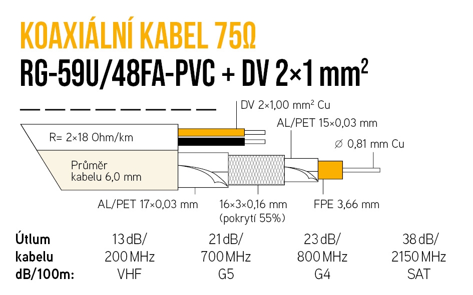 KABEL KOAXIÁLNÍ RG-59U/48FA-PVC BÍLÁ 6MM + 2X1MM 305M KK31W