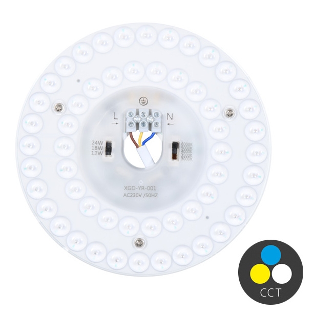 Magnetický SMD modul je důstojná LED náhrada za konvenční patice, které stačí ze svítidla odstranit. Pomocí magnetu pak lze modul jednoduše přiložit ke kovové podstavě a zapojit. Modul má nastavitelný výkon (12-18-24W) a také nastavitelnou barvu světla.