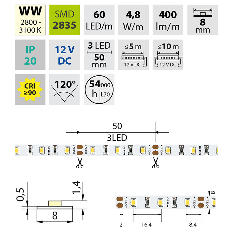 MCLED LED PÁSEK SMD2835 WW 4,8W/400LM/60LED/M 12VDC IP20 Š. 8MM CRI90 50M ML-121.831.60.2