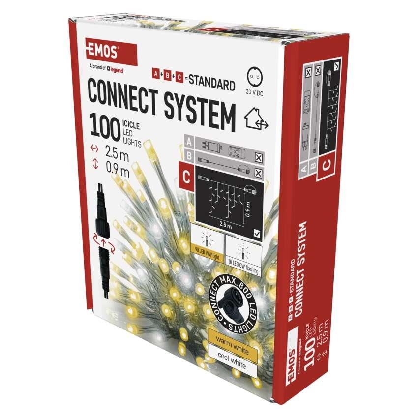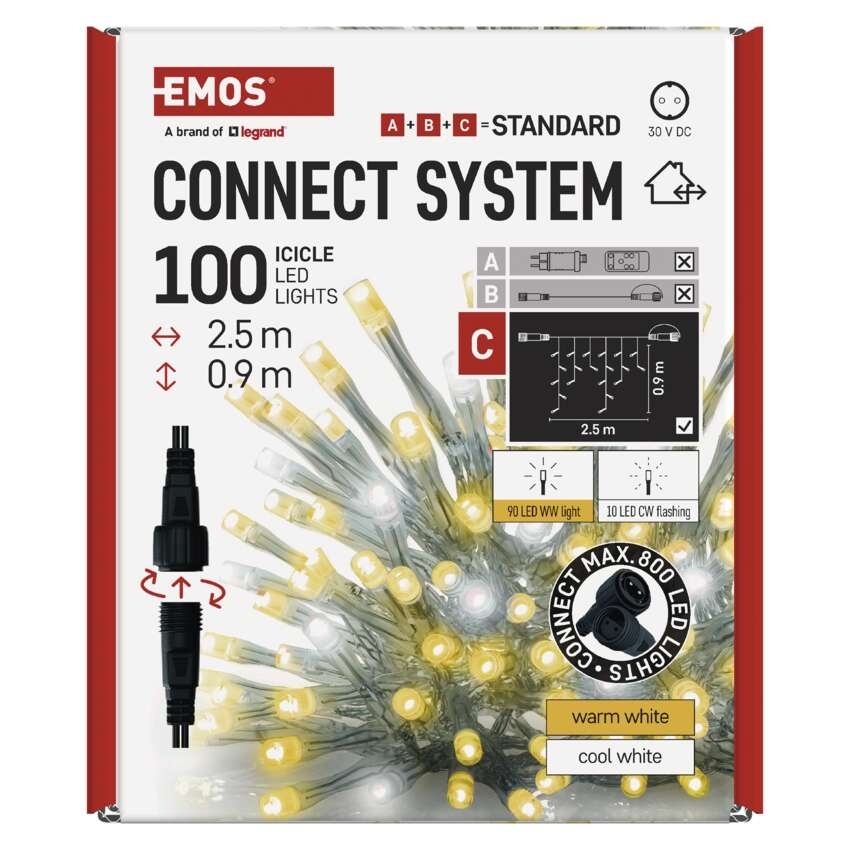 LED propojovací vánoční řetěz EMOS Connecting D1CN01 100LED krápníky studená/teplá blikající bez zdroje