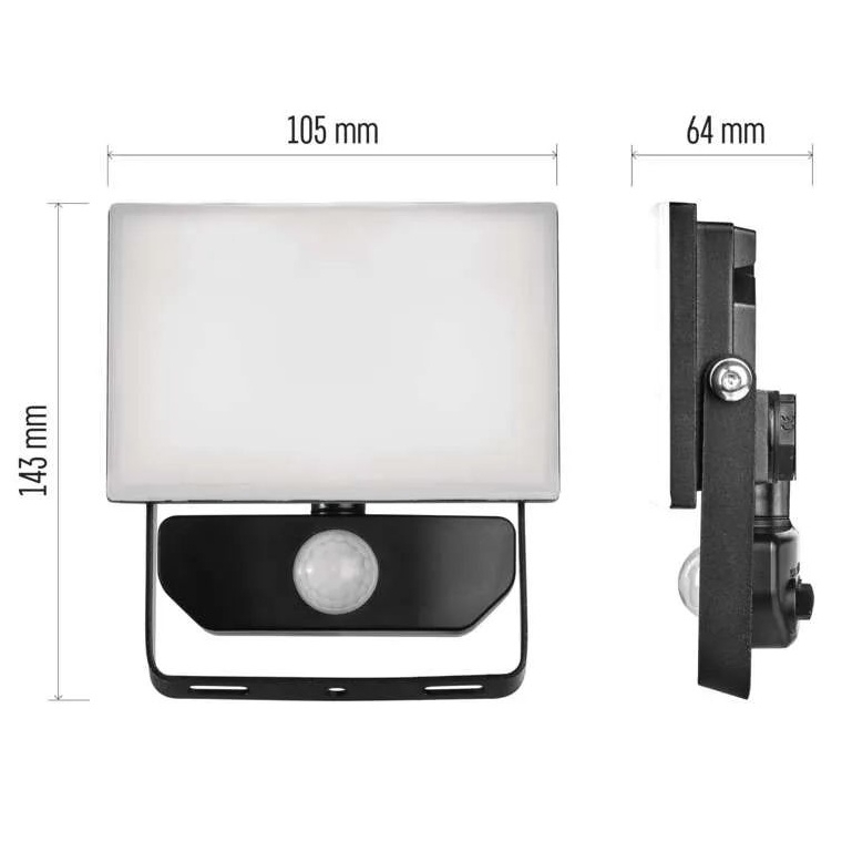 LED reflektor s integrovaným PIR senzorem pohybu, který je ideální volbou pro automatizované venkovní osvětlení. S příkonem 10 W a světelným tokem 1000 lm poskytuje neutrální bílé světlo (4000 K) s širokým vyzařovacím úhlem 120°. Detekční senzor s dosahem až 10 m umožňuje nastavení soumrakového čidla i délky sepnutí v rozmezí 10 s až 10 min. Reflektor má krytí IP54, odolnost proti nárazu IK06, tělo z hliníku a difuzor z plastu (PC), což zajišťuje odolnost vůči povětrnostním vlivům. S životností 25 000 hodin je vhodný pro nenáročné venkovní aplikace v komerčním i soukromém sektoru.