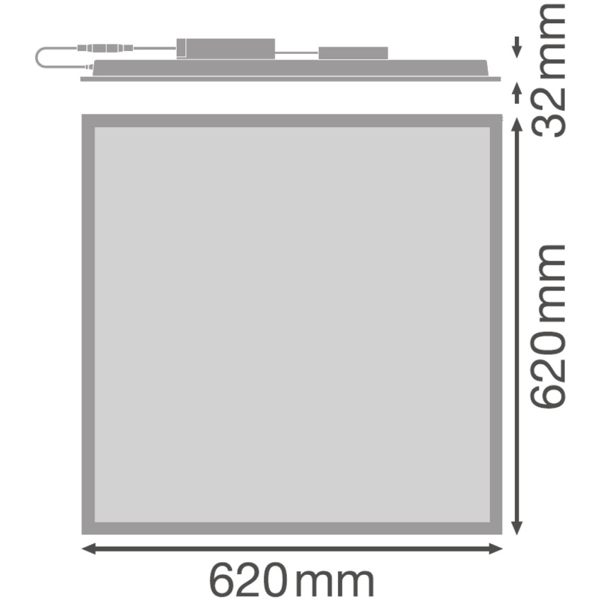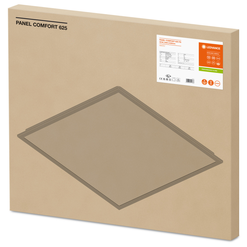 Čtvercová vestavná panelová svítidla s funkcí power select (PS), pro stropní systémy 625 x 625 mm. Vlastnosti produktu: Rám z protlačovaného hliníku. Polystyrenový difuzor. 5pólová svorkovnice, průřez kabelu do 5 x 2,5 mm². K dispozici jsou verze svítidel s ovladačem DALI-2 připraveným na IoT. Životnost (L80/B10): 70 000 h (při 25 °C). Výhody produktu: Vysoce univerzální díky volitelným stupňům výkonu (Power Select - PS) na driveru. Elektrické propojení bez použití nářadí díky zasouvacímu konektoru. Možnost průchozí kabeláže pomocí dodané připojovací krabice. Energeticky úsporné díky vysoké účinnosti systému: až 130 lm/W. Vysoká barevná konzistence s SDCM 3. V provedení s DALI jsou k dispozici rozšířené služby jako např. sledování spotřeby energie a dálková údržba. Externí předřadník pro dodatečnou flexibilitu a snadnou instalaci. Světlo s nízkou úrovní blikání díky speciálnímu předřadníku. Možnost nouzového osvětlení díky nouzovému modulu LEDVANCE. 5letá záruka. Druh použití: Přímá náhrada za vestavná svítidla se zářivkami. Kanceláře, konferenční místnosti. Recepce, vstupní haly, chodby, výtahy. Vhodné pro systémy zapuštěných světel do stropů o velikosti mřížky 625 × 625 mm. Výbava / příslušenství: K dispozici je příslušenství pro několik způsobů montáže. Včetně připojovací krabice s 5 pólovou svorkovnicí. Předinstalované bezpečnostní držáky. Včetně externího předřadníku. Vhodné pro použití se samostatným nouzovým modulem.