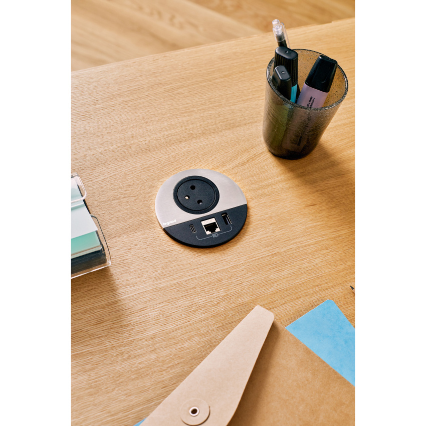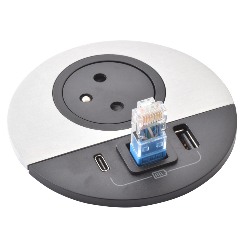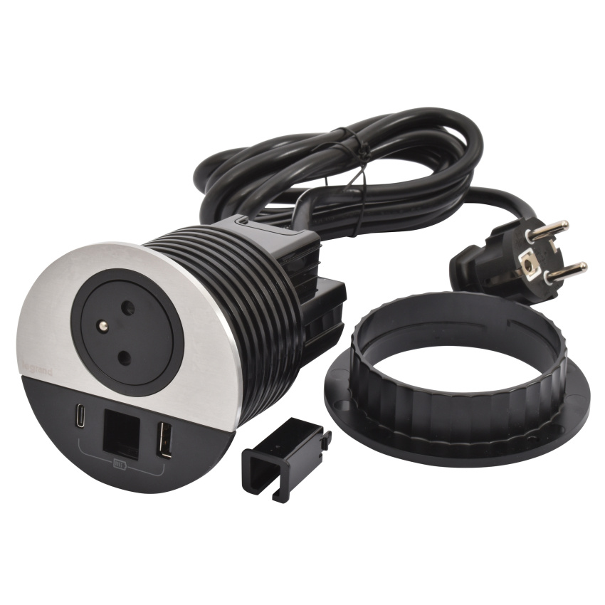LEGRAND INCARA 654708 ZÁSUVKA ZAPUŠTĚNÁ DISQ 80 2P+T USB A+C ČERNÁ/KOV KABELOVÁ VÝVODKA 2M KABEL S VIDLICÍ 2P+T