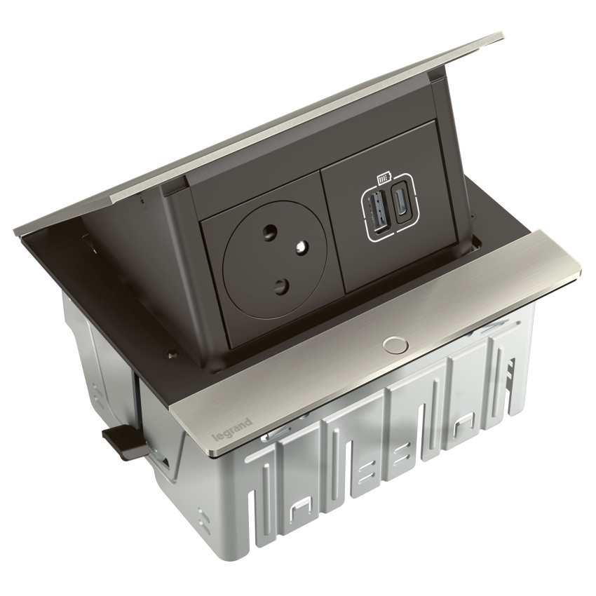 Předvybavená Pop-up výklopná krabice umožňuje připojit zařízení do 2P+T zásuvky a do nabíječky USB typu A+C.