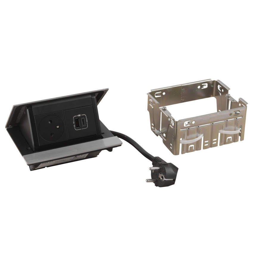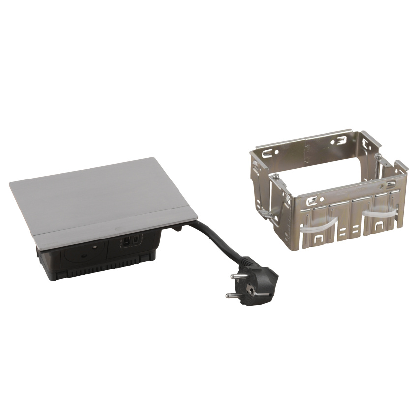 LEGRAND INCARA 654816 KRABICE DO NÁBYTKU POP-UP OSAZENÁ BROUŠENÝ HLINÍK 4M 2P+T USB A+C 15W 2M KABEL S VIDLICÍ 2P+T