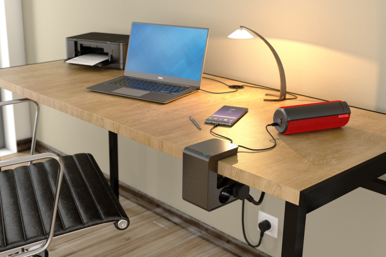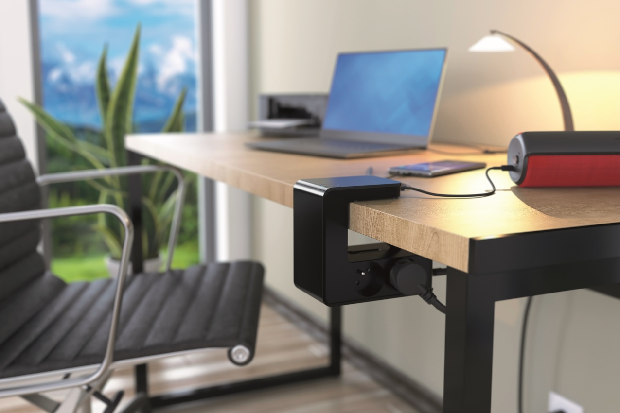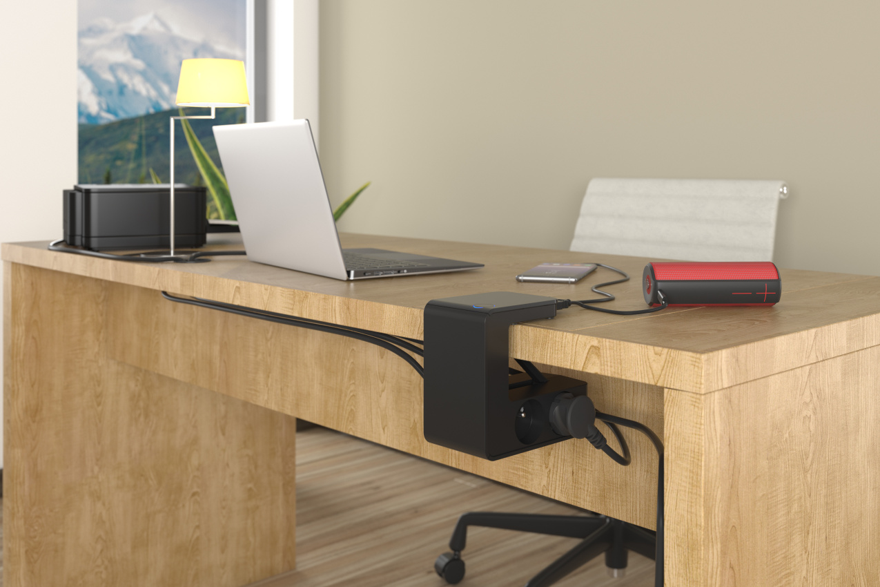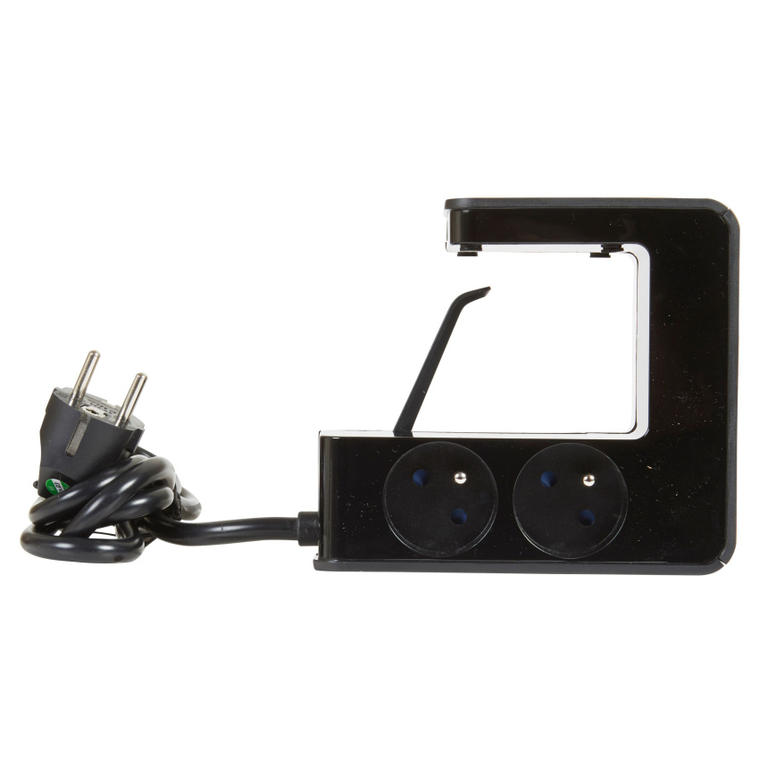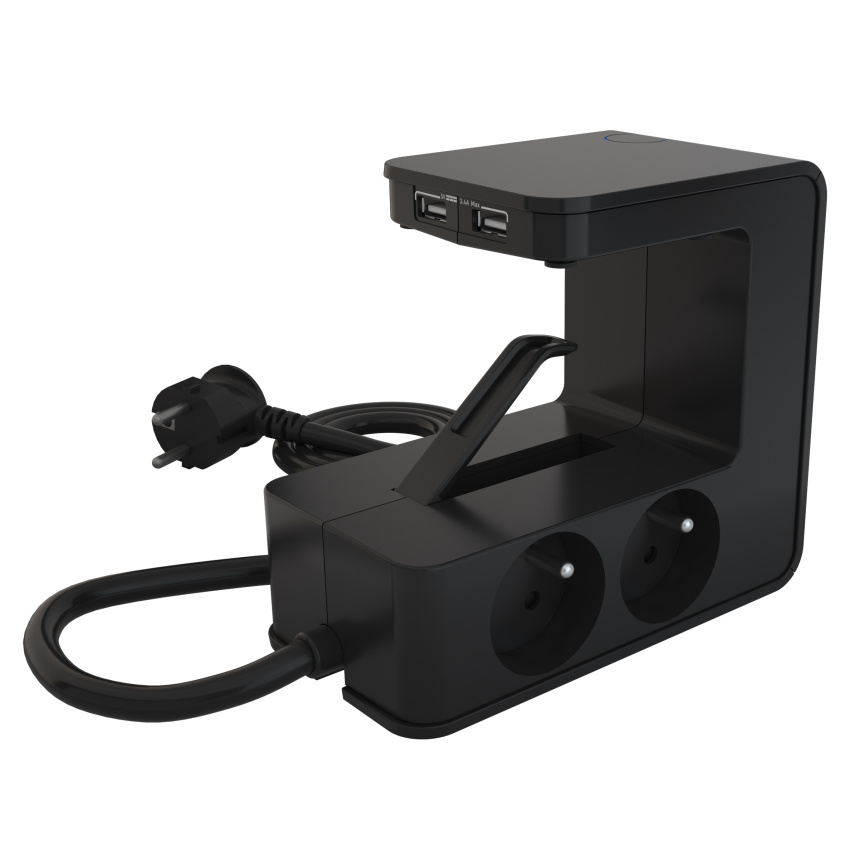 Prodlužovací prodlužovací kabel s klipsem se 4 zásuvkami 2P+E, 2 porty USB Type-A a podsvíceným vypínačem - černý