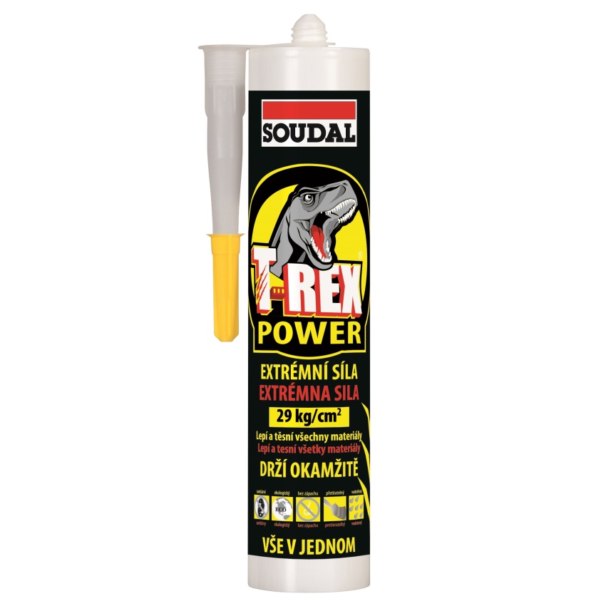 T-REX s unikátní technologií SMX firmy SOUDAL je nejuniverzálnějším produktem s nejširším použitím na trhu. Svými vlastnostmi předčí většinu tmelů a lepidel. Jako silikon je stejně odolný proti UV záření a stejně pružný, jako akrylátový tmel je přetíratelný většinou nátěrů a jako polyuretanový tmel má silné lepicí účinky. Je vhodný pro vnitřní i venkovní použití a má výbornou přilnavost k většině stavebních materiálů. Neobsahuje rozpouštědla, kyseliny ani izokyanáty. Neztrácí své vlastnosti ani v prostředí se zvýšenou vlhkostí, je vhodný pro sanitární účely. Vysoká počáteční přilnavost T-REX předurčuje pro přímé lepení bez nutnosti fixace.<br><br><strong>Charakteristika produktu</strong><ul><li>extrémně vysoká počáteční přilnavost, při celoplošném nanesení > 200kg/m<sup>2</sup></li><li>dokonalá adheze a rychlé vytvrzování na téměř všech porézních i neporézních stavebních materiálech</li><li>přilnavý i na vlhké povrchy</li><li>snadno zpracovatelný bezprostředně po aplikaci a opracovatelný po vytvrzení</li></ul> <strong>Příklady použití</strong> <ul><li>montážní lepení i tmelení v domácnosti, ve stavebnictví a strojírenství, především ve výrobě dopravních prostředků ( automobily, autokary, karavany, lodě, vlaky, letadla, nástavby vozidel atd.)</li><li>aplikace v kuchyních a sanitárních místnostech – hmota obecně odolává růstu plísní</li><li>elastické lepení panelů, desek, sendvičů, profilů aj. dílů na většinu běžných podkladů</li><li>přetíratelný výrobek k výplni mezer či otvorů</li></ul>