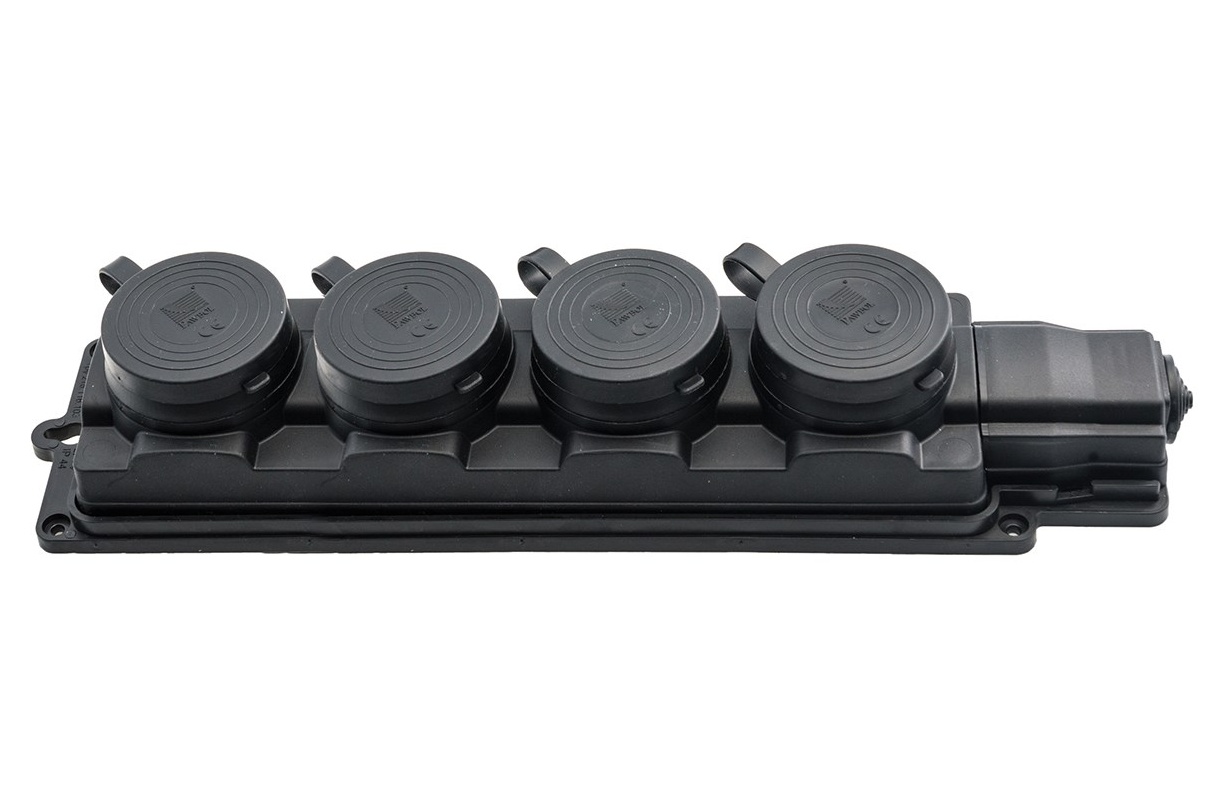 Zásuvka gumová 4-násobná 16A/250V, IP44, černá.