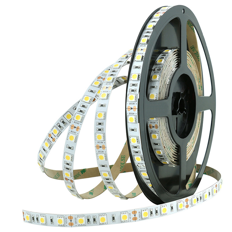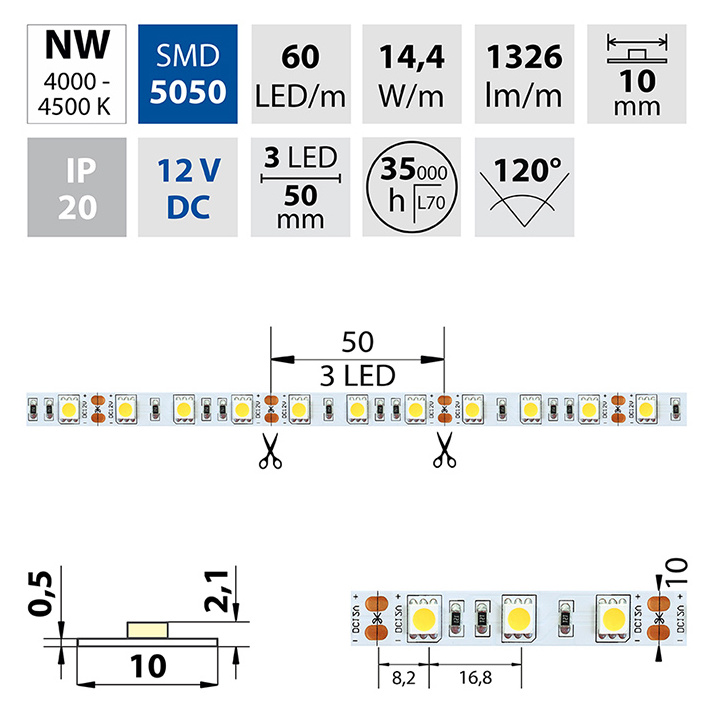LED pásek SMD5050, neutrálně bílá (4200K), 14,4W, 60LED, 1296lm/m, segment 50mm, 3LED/segment, IP20, DC 12V, životnost 54000h, šíře 10mm, bílý PCB pásek, max. délka pásku při jednostranném zapojení: 5m, opatřen samolepící páskou 3M, UV stabilní.