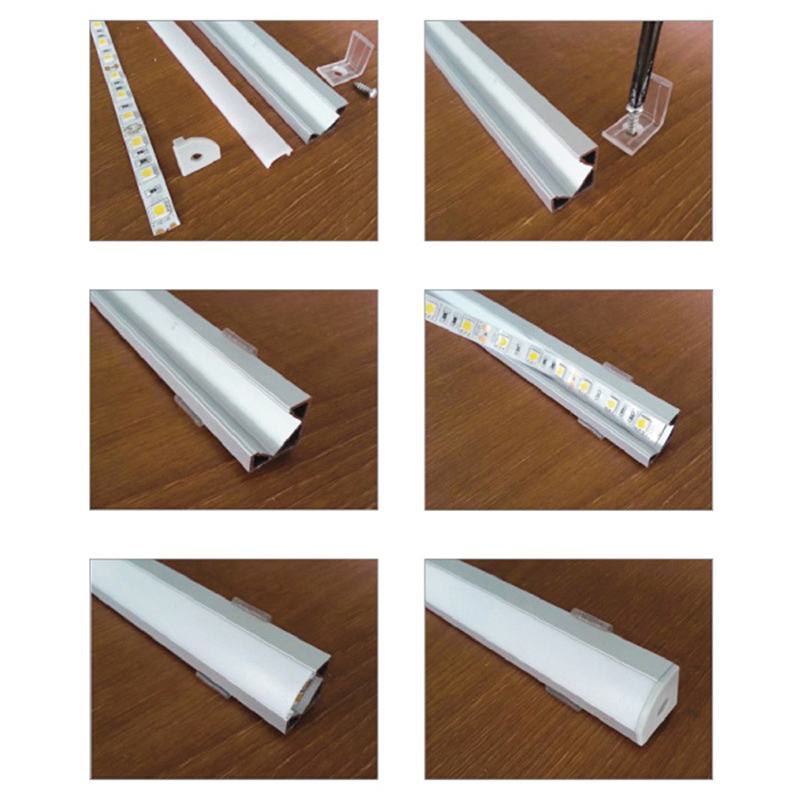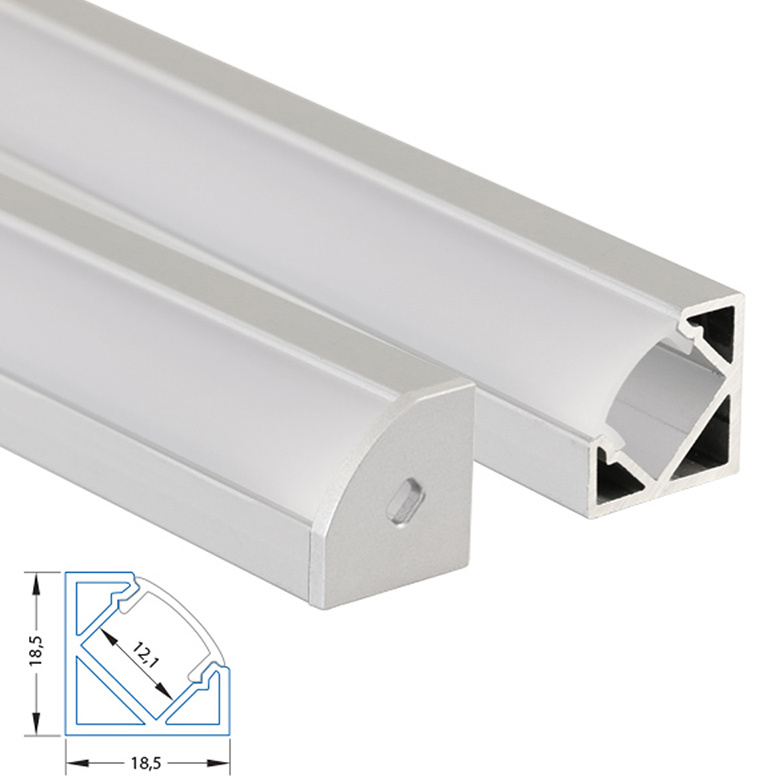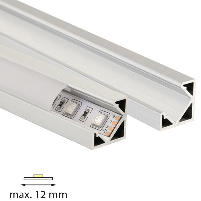 Rohový hliníkový profil pro LED pásky, rozměry průřezu cca 19x19 mm. Součástí je matný difuzor, který lze do profilu nacvaknout. Tento profil je určen pro krytí a chlazení LED pásků do šíře 12 mm. Upevnění k podkladu lze provést pomocí montážních úchytů, vrutů, lepidel. K profilu lze zakoupit úchyty a koncovky.