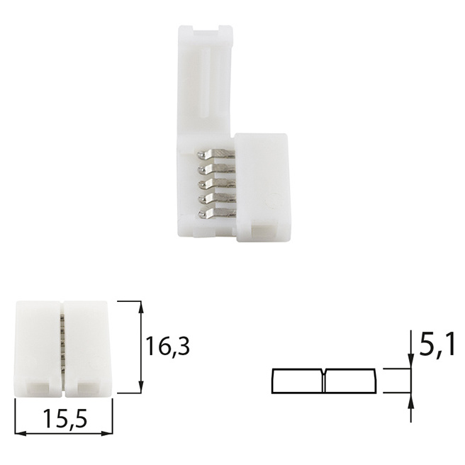 Spojka dvou RGBW 12mm LED pásků se 60xLED 5050/m. Slouží k propojení dvou LED pásků, do kontaktů v konektoru se vsune LED pásek a konektor se zaklapne. Tato spojka je určena pro max. proud 2A, pro větší proudy je třeba LED pásky spojit pájením. Rozměry cca 15,5x16,3x5,1 mm.