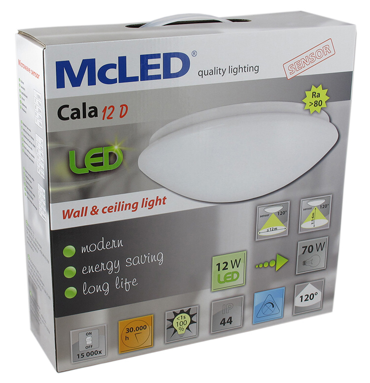 - LED svítidlo Cala je vybaveno mikrovlnným pohybovým senzorem ukrytým uvnitř těla svítidla. Dosah tohoto senzoru je až 6 metrů, detekční zónu si ale můžete snadno přizpůsobit v rozsahu 10 – 100 %.