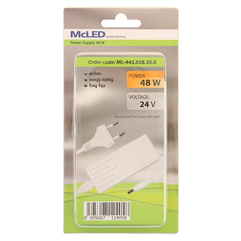 LED napěťový zdroj pro McLED LED lineární svítidlo, výkon 48 W. Zdroj je opatřen konektorem ke snadnému připojení ke svítidlu. Rozměry: 115,5x52x34,5 mm, hmotnost: 0,355 kg. Barva: bílá. Pro připojení do zásuvky. Vstup: 100-240VAC, výstup DC 24V/2A. V kombinaci s dotykovým stmívačem ML-443.023.35.0 umožňuje stmívání. Po ukončení používání ekologicky zlikvidujte.