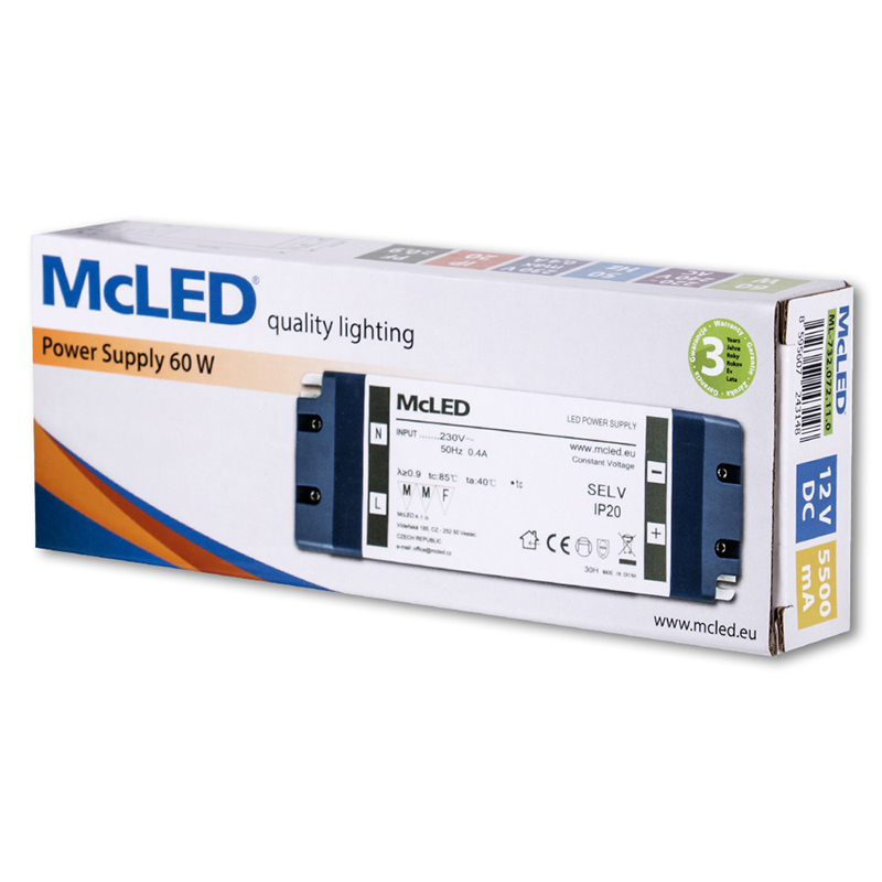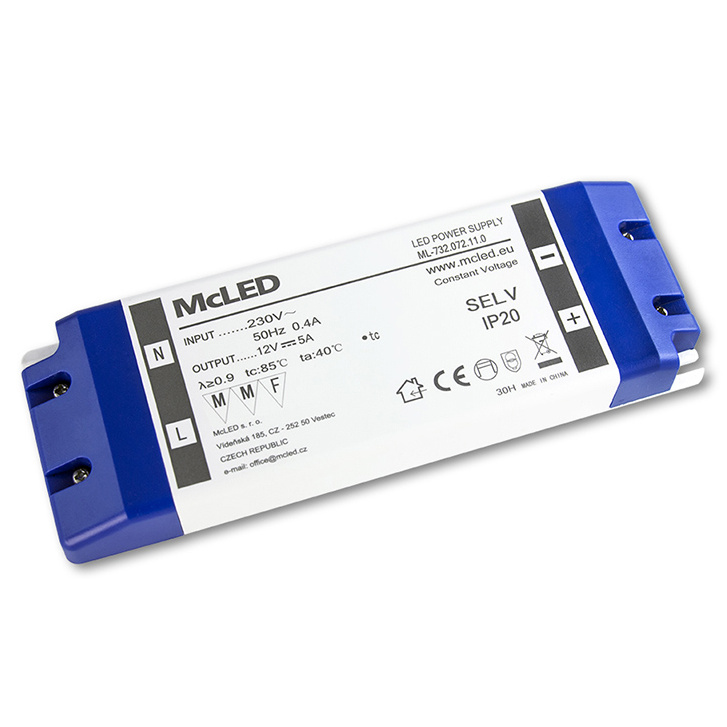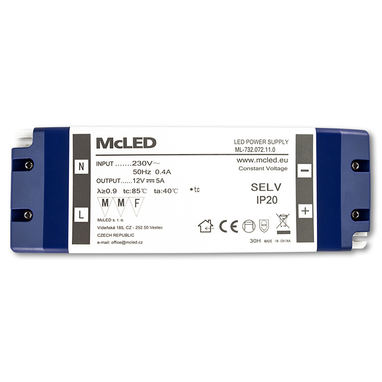 MCLED ZDROJ NAPÁJECÍ 60W DC12V/5A IP20 PLASTOVÉ PROVEDENÍ SE SVORKOVNICÍ ML-732.072.11.0