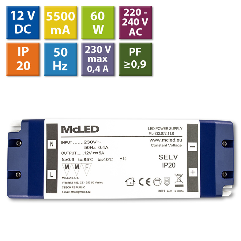 LED napěťový zdroj pro LED pásky 60 W, výstup DC 12V/5A. IP20. Vstupní a výstupní svorkovnice. Vstupní napětí 220 - 240V AC, materiál krytu: plast, barva bílá. Rozměry 185x64x22 mm, hmotnost 0,23 kg. Zdroj SELV, certifikáty: CE, RoHS, MM, F. Při výběru zdroje počítejte s výkonovou rezervou min. 20 %.