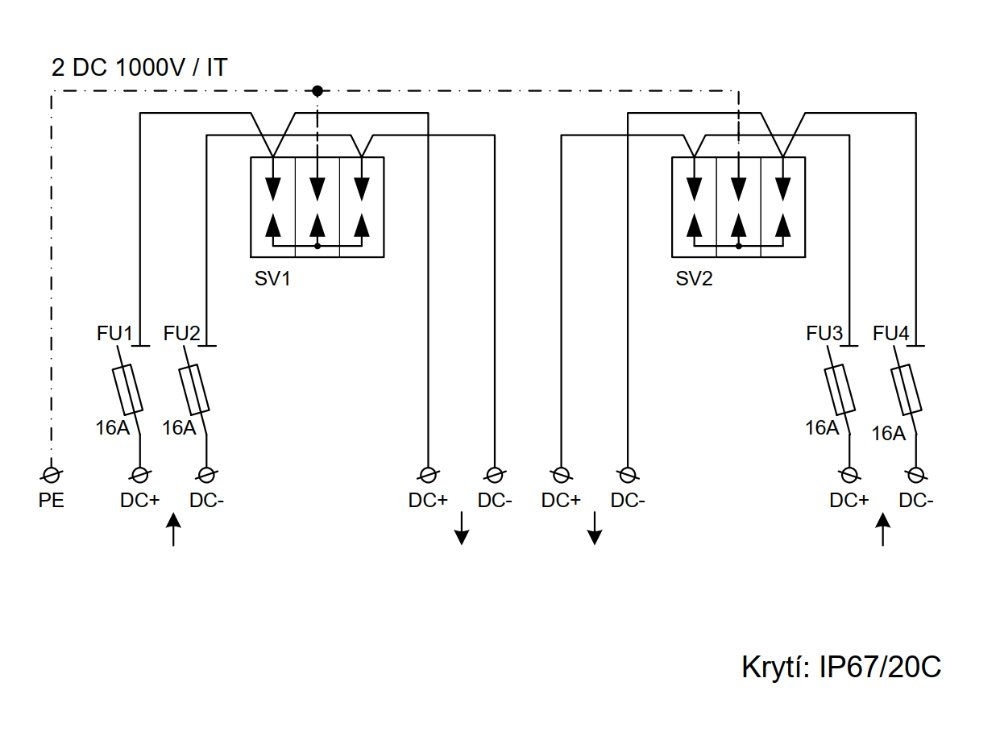 Fotovoltaický rozvaděč pro 2 stringy, ochrana DC vedení o max. napětí 1000V.