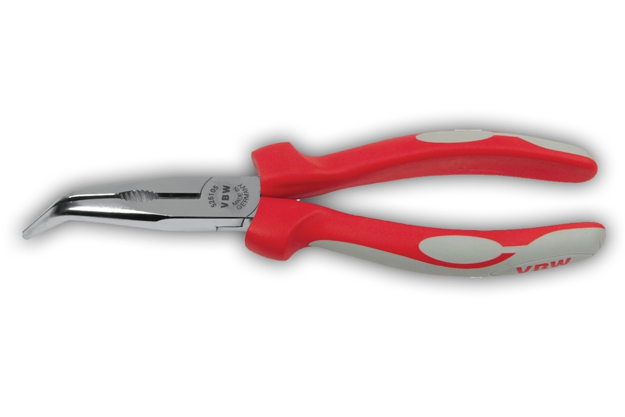 Kleště telefonní zahnuté 45st., vyrobeny ze speciální nástrojové oceli, kalené v oleji, chromované, leštěné, zahnuté půlkulaté ozubené čelisti k uchopení menších součástí, indukčně kalené břity cca. 60 HRc pro štípání tvrdého a středně tvrdého drátu, nová pohodlná multikomponentní rukojeť speciálně tvarovaná proti sklouznutí ruky směrem k čelisti, rukojeť vyrobena ze speciální plastické hmoty odolávající agresívnímu prostředí.