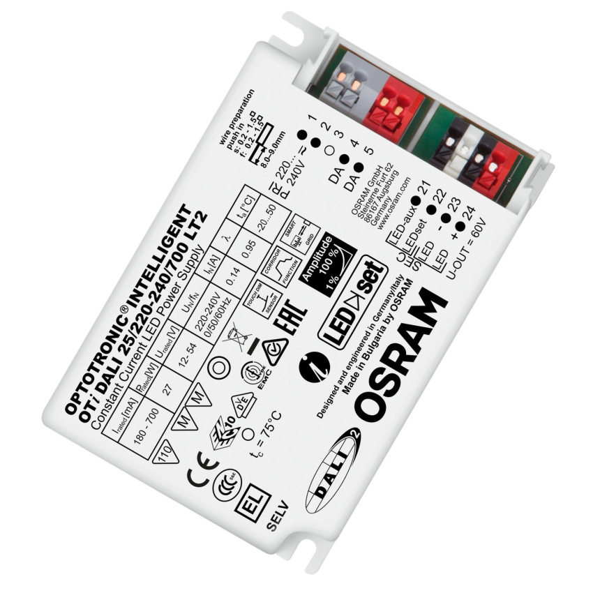 Výhody produktu: Univerzální předřadník DALI díky flexibilním vlastnostem výstupu. Ochrana systému prostřednictvím tepelného managementu a inteligentního řízení. Snadné používání v chodbách a na toaletách díky trojúrovňové funkci Corridor. Aplikace Touch DIM®: snadné ovládání pomocí tlačítka nebo čidla. Energeticky účinný provoz Touch DIM® díky automatickému vypínání při dostatečném zbytkovém světle. Vhodné pro instalace nouzového osvětlení (v souladu s EN 60598-2-22 a IEC 61347-2-13, dodatek J) díky DC detekci (0 Hz, pulzní DC), přepínatelné zap/vyp. Snížená spotřeba energie a delší životnost (vhodné pro SMART GRID). Vhodné pro budovy v souladu s EPBD/BREEAM/LEED díky automatickému nastavení Constant Lumen Output. Vlastnosti produktu: Napájecí napětí: 220…240 V. Kmitočet: 0 Hz | 50 Hz | 60 Hz. Síťové napětí: 198 – 264 V. Zabezpečení v souladu s EN 61347-1, 61347-2-3, 61347-2-13, 62384. Odrušení v souladu s EN 55015:2007+A1:2007/CDN. Harmonické složky ve vedení podle EN 61000-3-2. Odolnost v souladu s EN 61547. Nezávislé připojení pomocí přesmyčkování (kromě OTi DALI 15). Druh použití: Instalace do systémů nouzového osvětlení v souladu s IEC 61347-2-13, přílohou J. Vhodné pro použití ve svítidlech s flexibilním nastavením proudu (DALI, CLO, LEDset). Vhodné pro vnitřní SELV instalace. Vhodné pro svítidla třídy ochrany I a II. Instalace pomocí "Cable Clamp Kit" possible (závisí na verzi výrobku).