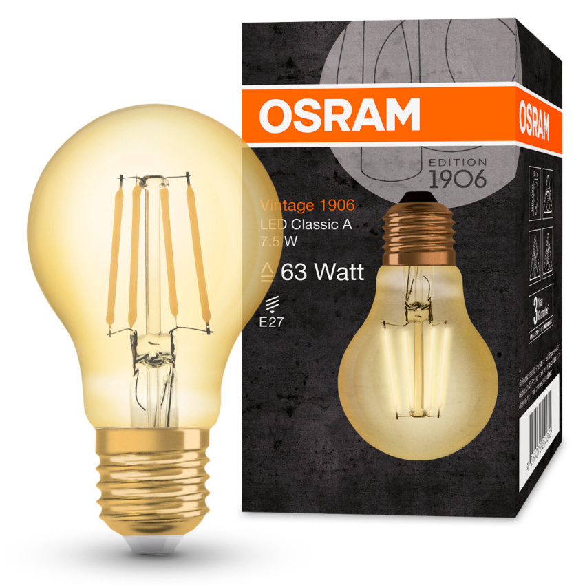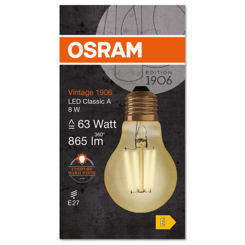 LED světelné zdroje, Edice Vintage. Vlastnosti produktu: LED světelné zdroje pro síťové napětí. Světelný zdroj je vyroben ze skla. Životnost: až 15 000 h. Vyzařovací úhel: až 360°. Dobrá kvalita světla, index podání barev R<sub>a</sub>: ≥ 80; konstantní barevnost. Výhody produktu: Velmi nízká spotřeba energie. Okamžitě 100 % světla, bez náběhu. Může být snadno namontováno místo obyčejných žárovek. Světelné zdroje s inovativní „filamentovou" technologií LED. Druh použití: Dokonalé pro ozdobné instalace. Domácí použití. Všeobecné osvětlení. Pouze pro vnitřní použití, nevhodné pro venkovní použití.