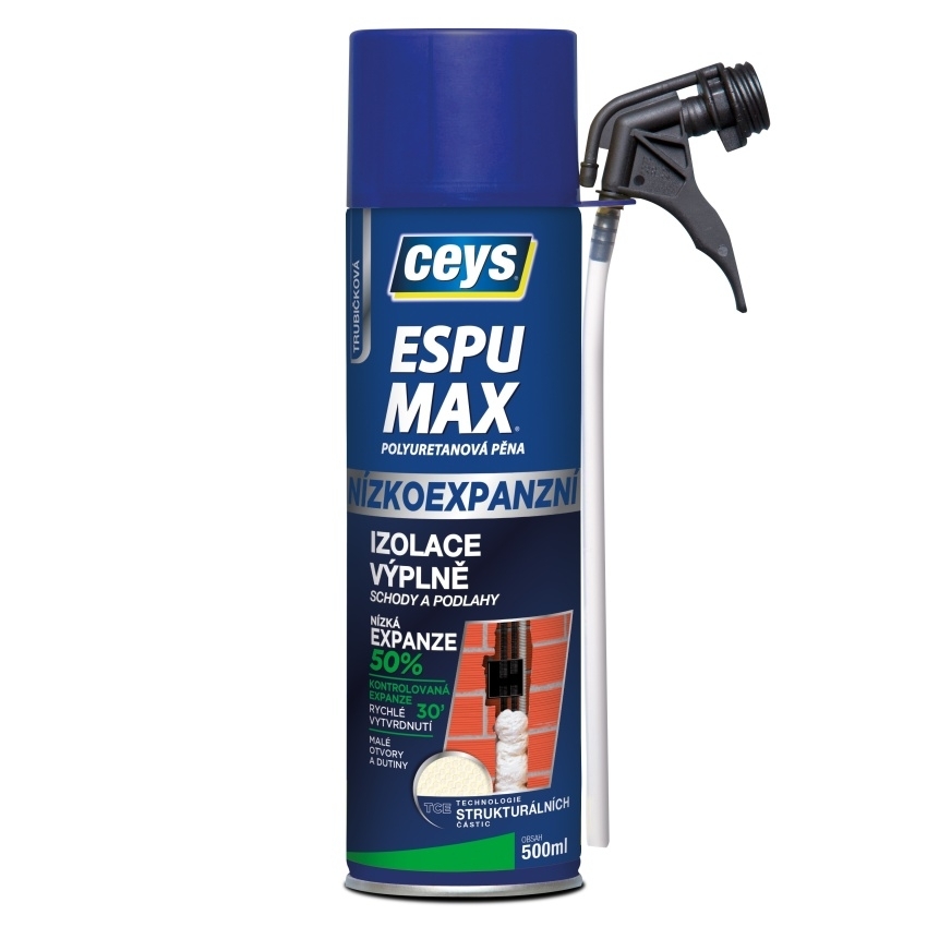 Nízkoexpanzní PU pěna (20 – 50 %) je speciálně určena pro tepelné a zvukové izolace mezi potrubím a rourami, el. Zařízení, klimatizaci; upevněni všech druhů materialů, profilů a obkladů, kde je zapotřebí výplně. Poslouži také jako vyplň všech druhů dutin, profilů, především ne příliš širokých, roletových schránek a vyplň a upevnění dveřních ramů se snížením rizika vydutí. S technologií strukturálních částic – Espumax nízko expanzní obsahuje částice s nízkou rozpínavosti, které umožňuji kontrolovaný růst pěny. V kombinaci s velmi lehkou kanylou a ergonomickou zátkou umožňuje, aby se pěna dobře a jednoduše aplikovala v přiměřeném množství. Nízko expanzní pěna má dvojnásobně větší pokryti než standardní pěna s vysokou expanzi.
