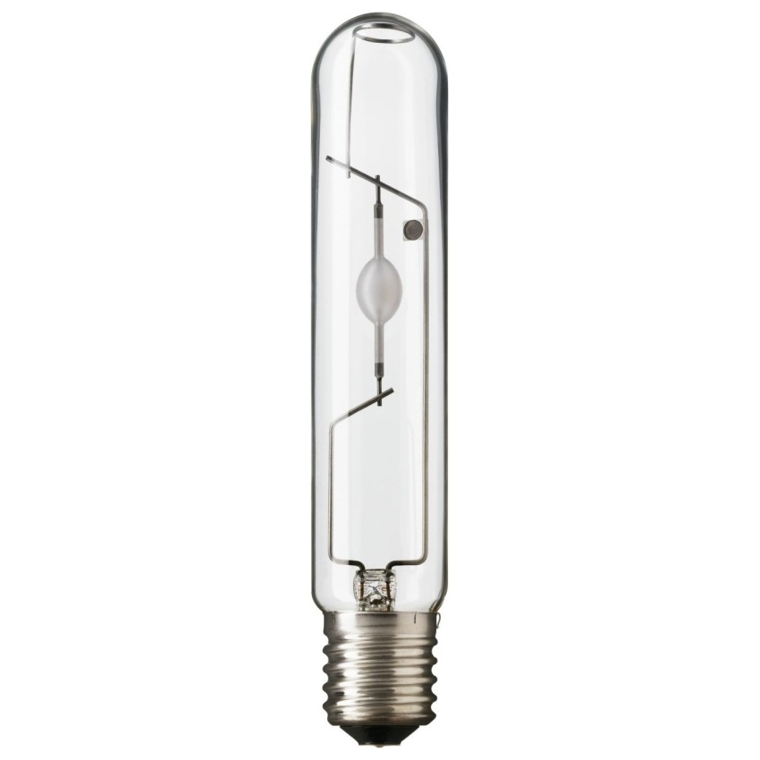 Halogenidová výbojka s keramickým hořákem a čirou tubulárnívnější baňkou, použitelná v exteriérech a poskytující příjemné bílé světlo