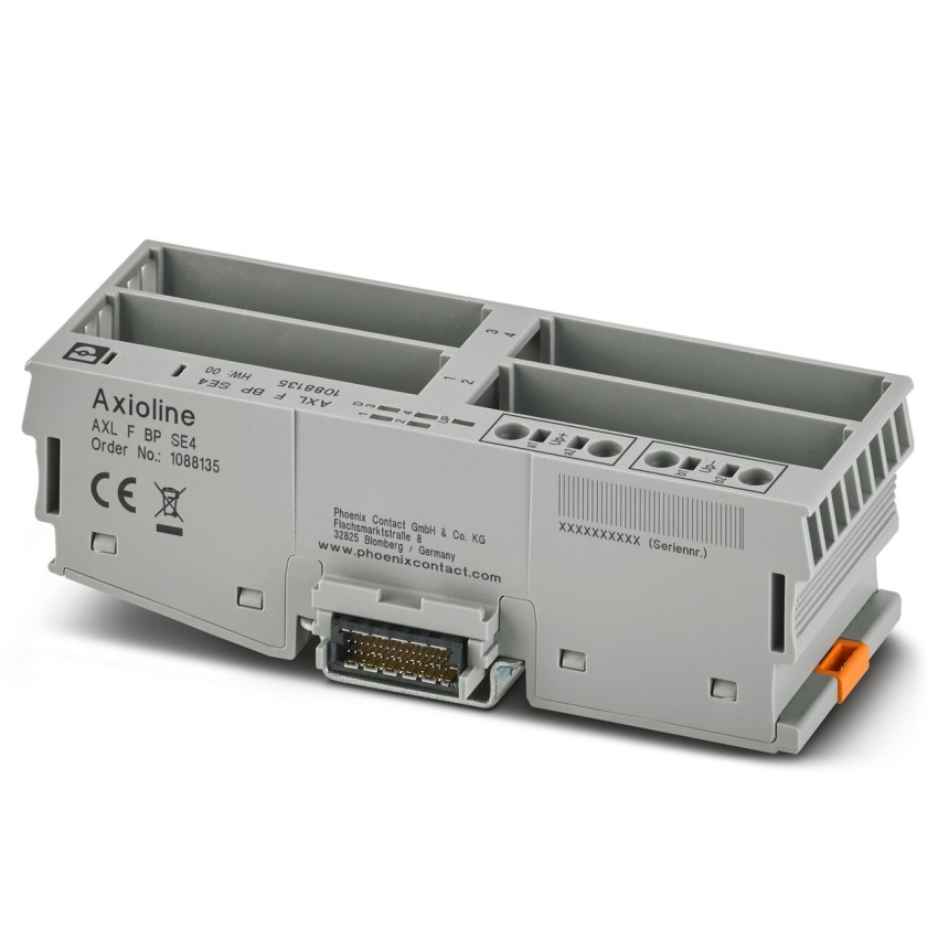 - Axioline F, Backplane, 4 sloty pro chytré prvky Axioline, přenosová rychlost v místní sběrnici: 100 MBit/s, krytí: IP20