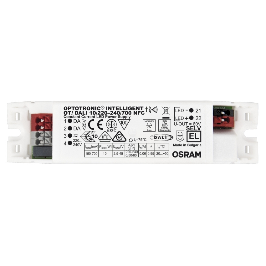 LEDVANCE OTi DALI 10/220-240/700 NFC je moderní a kompaktní LED předřadník určený pro širokou škálu svítidel, jako jsou downlighty, bodová světla nebo LED panely. Díky podpoře technologie DALI-2 a NFC programování umožňuje snadné nastavení a flexibilní řízení osvětlení. Předřadník se vyznačuje vysokou účinností, kvalitním stmíváním v rozsahu 1–100 % a funkcí Corridor pro úsporu energie v prostorech s nízkou frekvencí pohybu. Je ideální pro vnitřní instalace, včetně systémů nouzového osvětlení, a lze jej použít ve svítidlech třídy ochrany I i II.