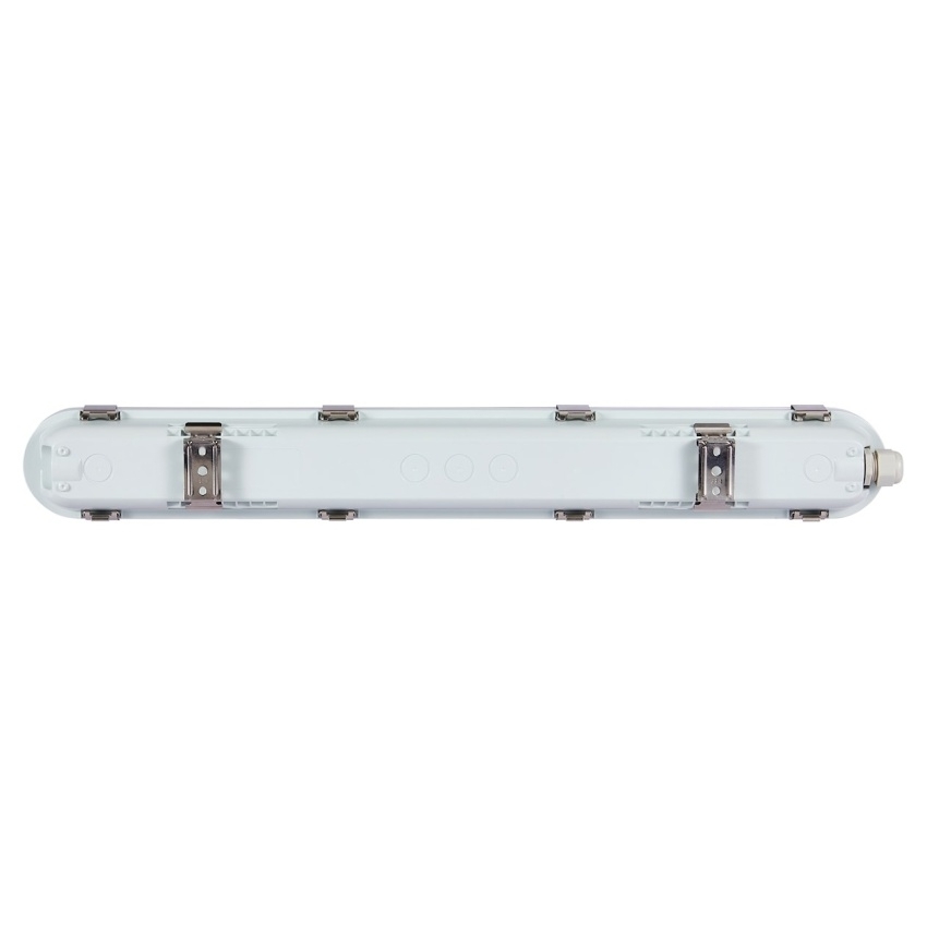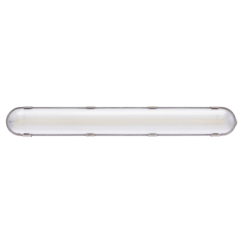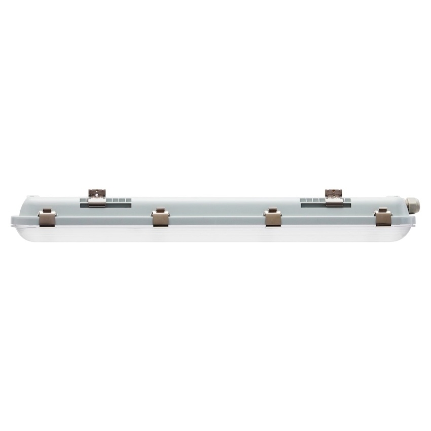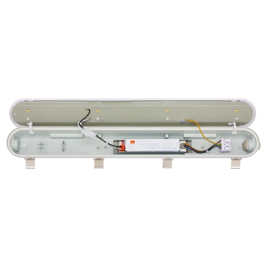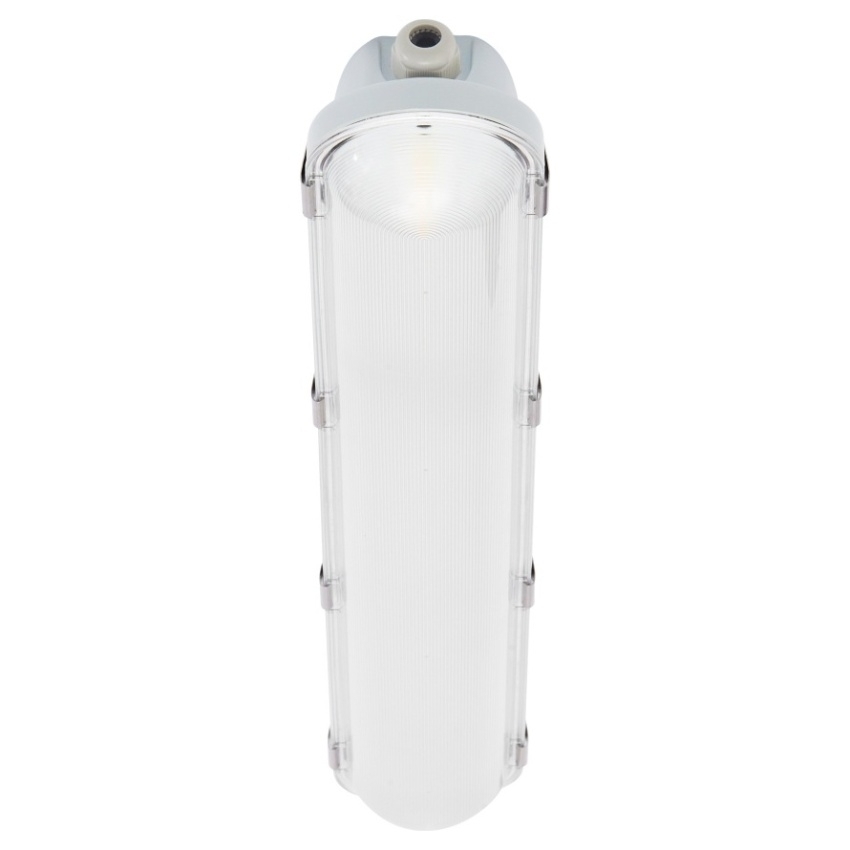 Start Eco Waterproof je odolné svítidlo pro použití například v parkovacích domech, skladech nebo dílnách. Jde o robustní svítidlo s krytím IP65 a mechanickou odolností IK08 v délce 600 mm se symetrickým širokým vyzařovacím úhlem. Světelný tok 1200 / 2400 lm se volí pomocí DIP přepínačů (odpovídající příkon 8 / 16 W) a integrovaným přepínačem lze zvolit teplotu chromatičnosti 3000 K / 4000 K / 6500 K; účinnost je 150 lm/W, CRI > 80 a SDCM < 5. Životnost je L70B50 62 000 h, elektrická ochrana Class I; pro instalaci jsou součástí nerezové spony difuzoru a upevňovací držáky pro přisazenou montáž, tělo i difuzor jsou z polykarbonátu a v balení jsou také závěsný hák, antivandal šrouby a doplňkové průchodky.