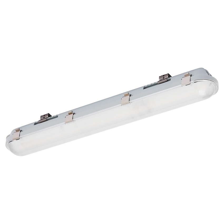 Start Eco Waterproof je odolné svítidlo pro použití například v parkovacích domech, skladech nebo dílnách. Jde o robustní svítidlo s krytím IP65 a mechanickou odolností IK08 v délce 600 mm se symetrickým širokým vyzařovacím úhlem. Světelný tok 1200 / 2400 lm se volí pomocí DIP přepínačů (odpovídající příkon 8 / 16 W) a integrovaným přepínačem lze zvolit teplotu chromatičnosti 3000 K / 4000 K / 6500 K; účinnost je 150 lm/W, CRI > 80 a SDCM < 5. Životnost je L70B50 62 000 h, elektrická ochrana Class I; pro instalaci jsou součástí nerezové spony difuzoru a upevňovací držáky pro přisazenou montáž, tělo i difuzor jsou z polykarbonátu a v balení jsou také závěsný hák, antivandal šrouby a doplňkové průchodky.