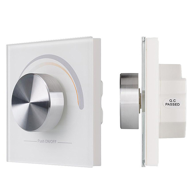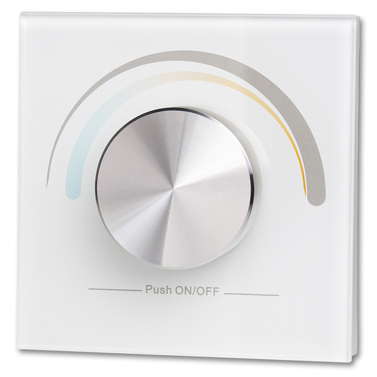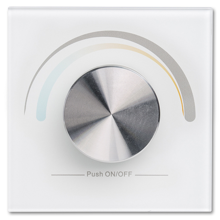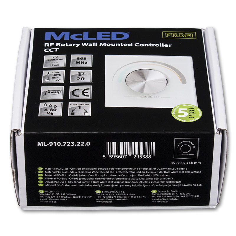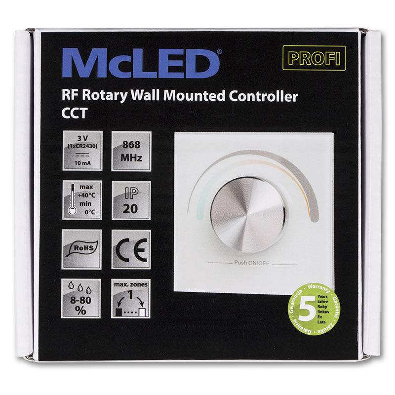RF dálkový otočný ovladač pro řízení jasu a teploty chromatičnosti CCT LED pásků umožňuje řízení jedné skupiny RF přijímačů (nejsou součástí), tato skupina může mít neomezeně přijímačů. Instalace do elektroinstalační krabice pomocí vrutů (součástí). Rozsah stmívání 1 - 100 %. Rozměry ovladače: 86×86×41,6 mm, napájení 1 x CR2032 baterie (součástí), dosah cca 20 m.