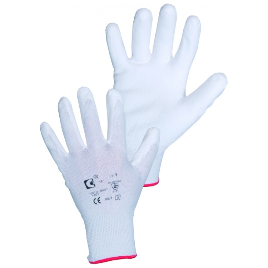 Rukavice z polyesteru bezešvý úplet dlaň a prsty máčené v PU CXS BRITA WHITE velikost 10 344000110010
