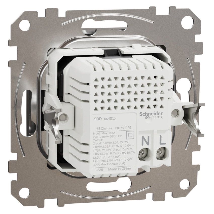 Nabíječka Schneider Electric Sedna Design Elements SDD170405U nabízí dva výstupy – USB-A a USB-C – s podporou technologií Power Delivery a PPS. Umožňuje rychlé a efektivní nabíjení zařízení, jako jsou smartphony, tablety, powerbanky či malá přenosná elektronika. Přístroj pracuje s výstupním výkonem až 21 W a vstupním napětím 220–240 V AC při frekvenci 50/60 Hz. Nabíječka je vybavena ochranou proti přetížení, zkratu, přepětí a přehřátí. Povrchová úprava v dekoru leštěného hliníku dodává moderní vzhled, zatímco zapuštěná montáž a šroubové upevnění zajišťují snadnou instalaci. Rozměry 73 × 73 × 44 mm umožňují kompatibilitu se standardními instalačními krabicemi a stupeň krytí IP20 je vhodný pro běžné interiéry.
