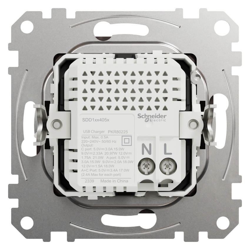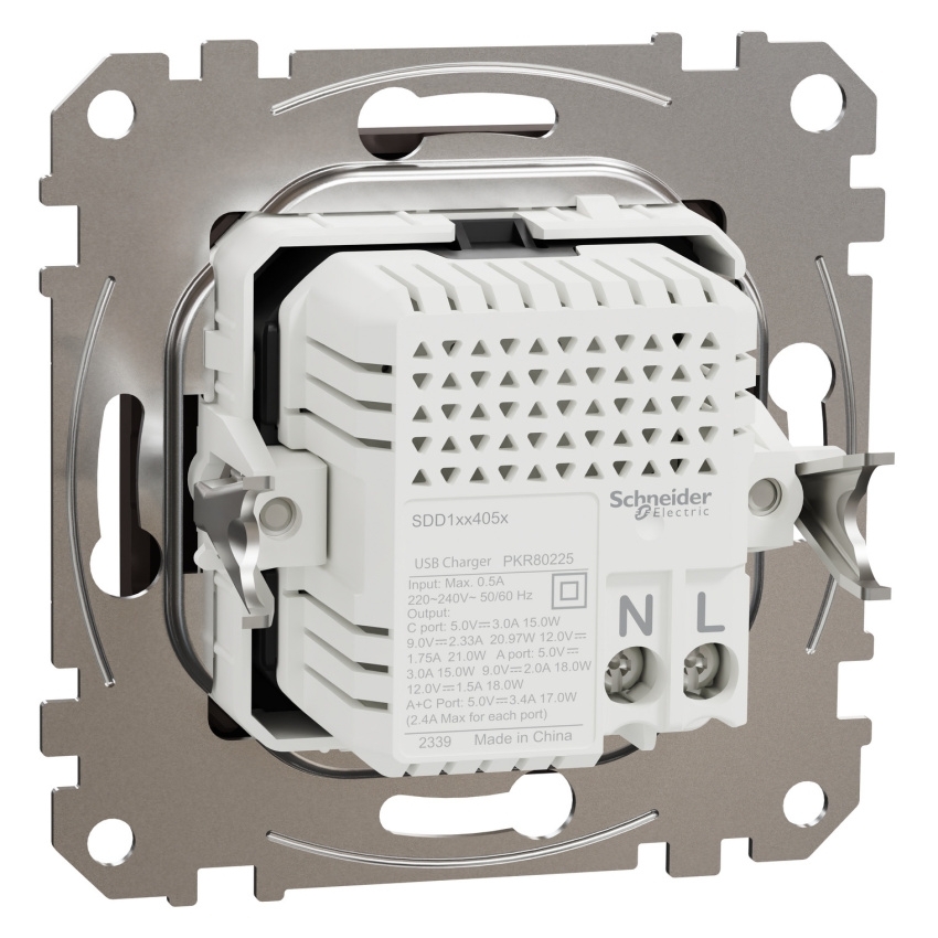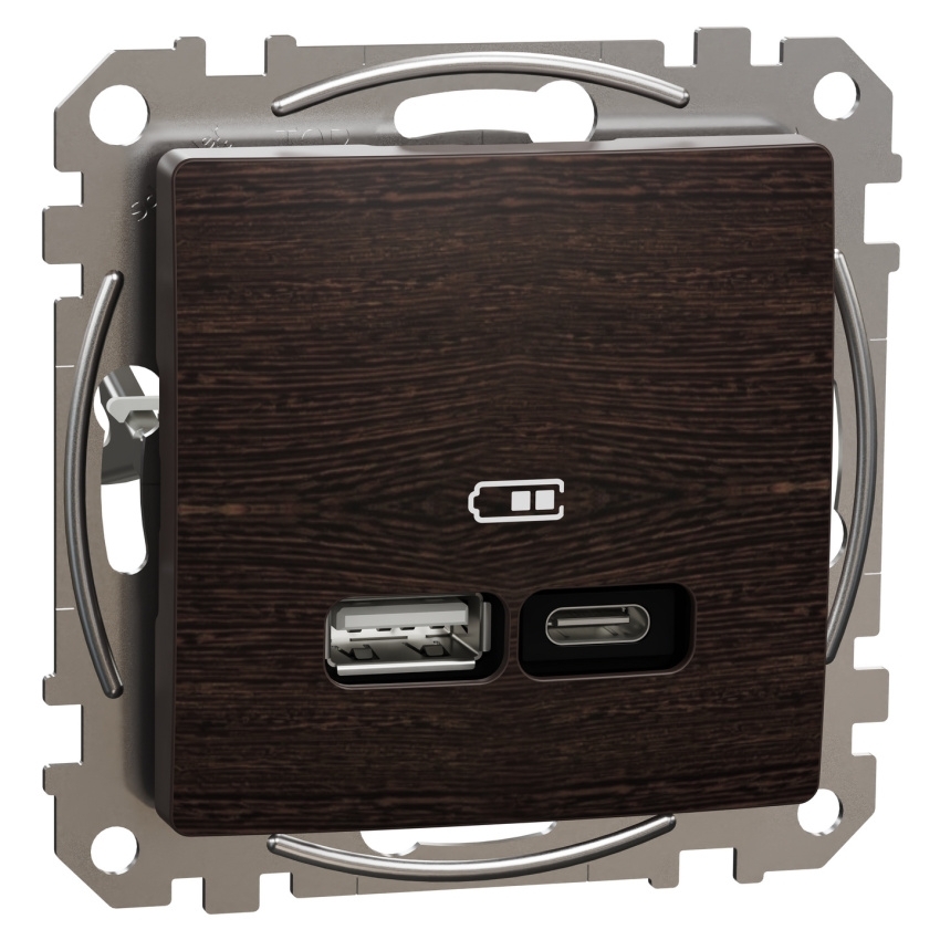 Dvojitá USB nabíječka Schneider Electric Sedna Design Elements SDD181405U je vestavný modul s porty USB-A a USB-C, určený pro pohodlné nabíjení mobilních telefonů, tabletů, menších notebooků a dalších zařízení přímo ze sítě 220–240 V AC. Využívá technologii USB Power Delivery s programovatelným napájecím zdrojem (PD PPS), která umožňuje nastavení maximálního výkonu v reálném čase a podporuje rychlé a optimalizované nabíjení. Celkový jmenovitý výstupní výkon nabíječky je 21 W, přičemž při současném využití portů USB-A a USB-C je k dispozici až 17 W, a nechybí pokročilá ochrana proti přehřátí, přetížení, zkratu a přepětí. Modul je navržen pro zapuštěnou montáž, upevňuje se pomocí šroubů a rozpěrek, má rozměry 73 × 73 × 44 mm (hloubka zapuštění 32 mm) a čelní část z PC/ABS v dekoru dřevo wenge (Pantone 439C) se semi-matnou povrchovou úpravou a krytím IP20.:contentReference[oaicite:0]{index=0}