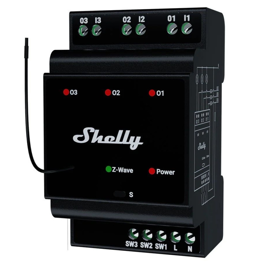 Shelly Wave Pro 3 LR je profesionální tříkanálový spínací modul určený pro montáž na DIN lištu, vybavený technologií Z-Wave Long Range a suchými kontakty pro spolehlivé řízení až tří nezávislých obvodů.