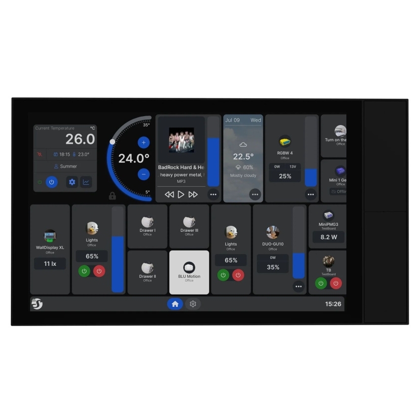 Shelly Wall Display XL Black je chytrý nástěnný ovládací panel s 10,1" dotykovým displejem, integrovaným relé 5 A a moderní konektivitou Wi-Fi 6 a Bluetooth 5.4, který sjednocuje řízení celé chytré domácnosti do jednoho elegantního zařízení.