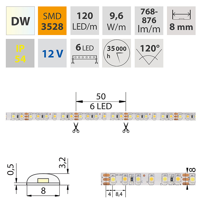 Stmívatelný LED pásek SMD3528 dual white EWW-CW (2700K-6000K), 9,6W, 120LED, 676lm/m, segment 50mm, 6LED/segment, IP54, DC 12V, životnost 54000h, šíře 8mm, bílý PCB pásek, max. délka pásku při jednostranném zapojení: 5m, opatřen samolepící páskou 3M. Na pásku se střídají LED studené a teple bílé, každý druh se dá nezávisle stmívat. Balení 5m.