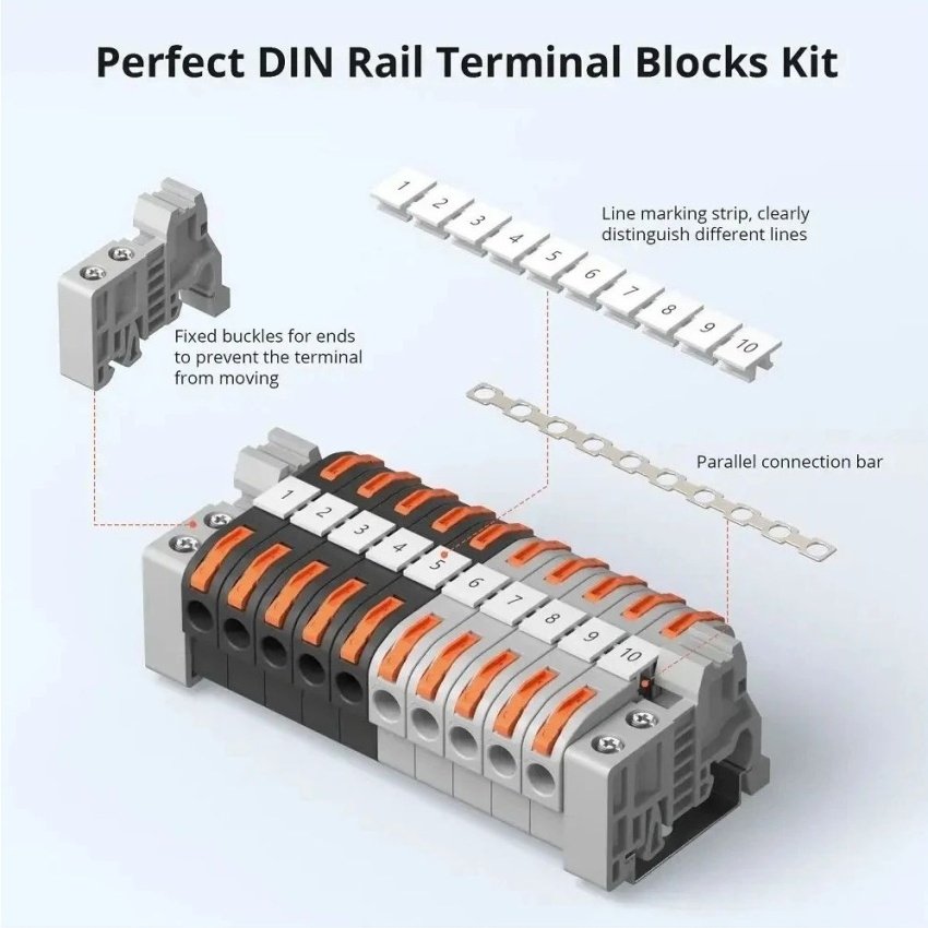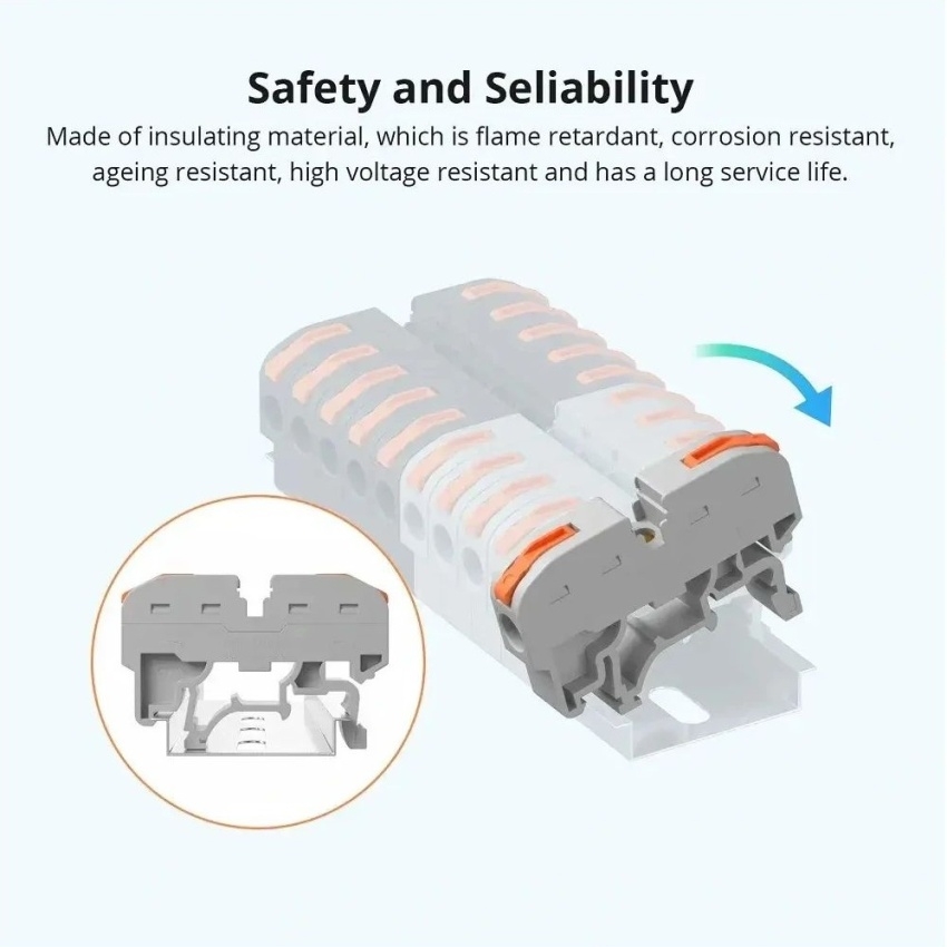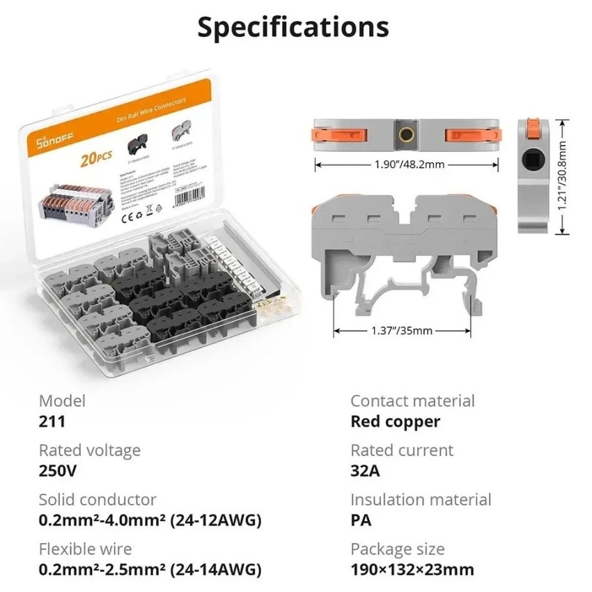 SONOFF 211 rychlosvorky pro vodiče na 35 mm DIN lištu umožňují beznástrojové, rychlé a bezpečné zapojení vodičů s pákovým mechanismem a měděnými kontakty. Izolace z nehořlavého PA66 zajišťuje odolnost při provozním napětí až 250 V a proudu 32 A.