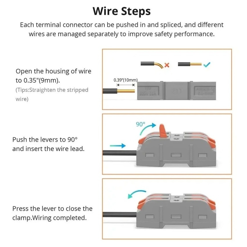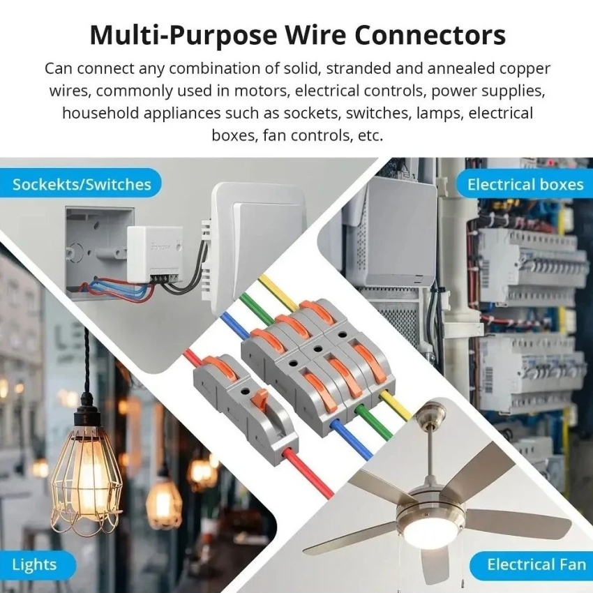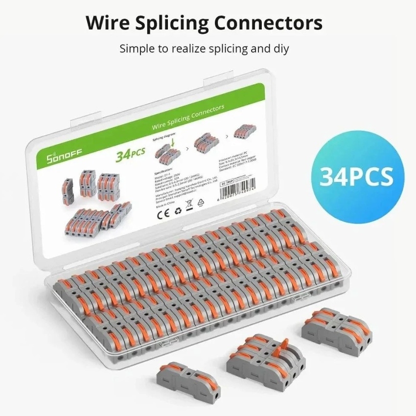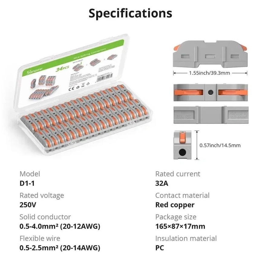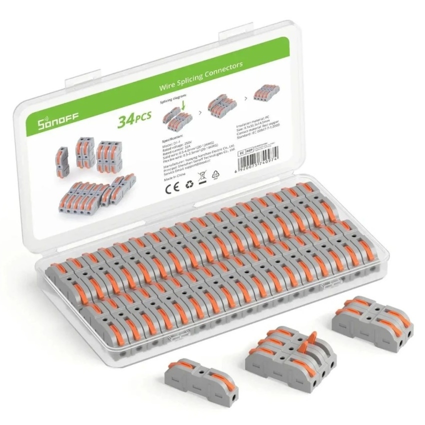 SONOFF D1-1 spojovací svorky umožňují rychlé a bezpečné zapojení vodičů bez použití pásky či šroubovacích matic díky pákovému mechanismu. Izolační pouzdro z nehořlavého PC materiálu zajišťuje odolnost proti teplu a korozi, zatímco měděné kontakty garantují spolehlivý elektrický kontakt. Svorky jsou kompatibilní s pevnými vodiči o průřezu 0,5–4,0 mm? a lankovými vodiči 0,5–2,5 mm?, což umožňuje široké využití v elektroinstalacích, automobilech i průmyslu.