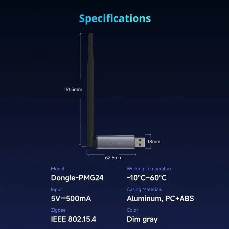SONOFF MG24 Zigbee a Thread USB Dongle Plus využívá výkonný čip EFR32MG24 s 1536 KB Flash a 256 KB RAM pro svižné automatizace a rychlé reakce zařízení. Externí anténa s 3 dBi ziskem (optimalizovatelná až na 4,5 dBi) umožňuje dosah až 200 metrů v přímé viditelnosti. Dongle podporuje flashování Zigbee koordinátoru, routeru, OpenThread nebo MultiPAN firmware pomocí SONOFF Dongle Flasheru a je kompatibilní s Home Assistant, Zigbee2MQTT, openHAB a dalšími platformami.