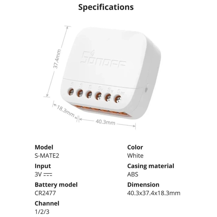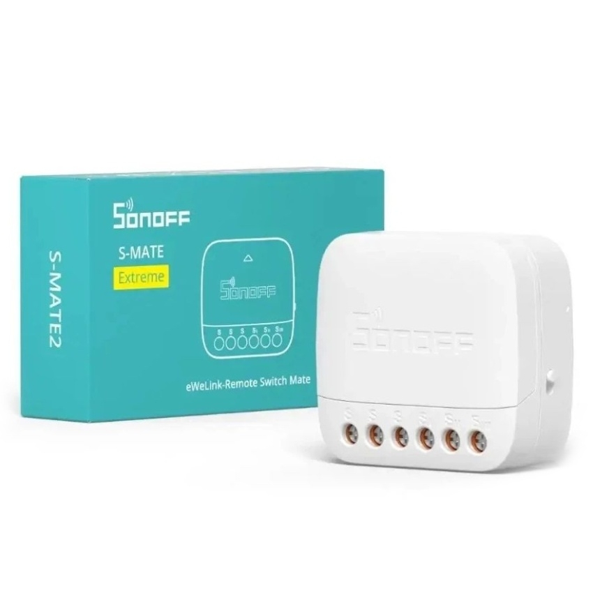SONOFF S-MATE2 Extreme Switch Mate umožňuje snadnou integraci chytrého ovládání do stávajících mechanických spínačů bez potřeby neutrálního vodiče. Napájen baterií CR2477 nabízí výdrž až 5 let a díky kompaktním rozměrům 40,3 × 37,4 × 18,3 mm se vejde do standardních montážních krabic EU/86 a typu 120. Ovládání je možné na vzdálenost až 50 metrů na otevřeném prostoru s možností přizpůsobení funkcí jednoho, dvojitého kliknutí nebo dlouhého stisku přes aplikaci eWeLink.