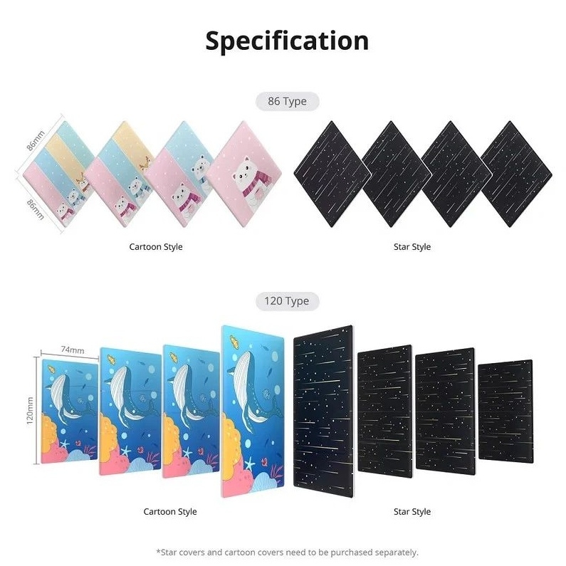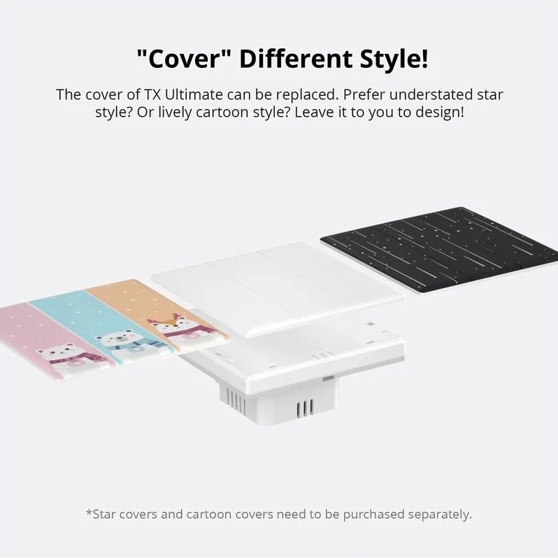 SONOFF TX Ultimate Smart Touch Wall Switch Cover v designu Hvězdy je vyměnitelný přední kryt určený pro 1-tlačítkový vypínač o rozměru 86 mm. Kryt se snadno nacvakne bez nutnosti použití nářadí či zapojování vodičů a zajišťuje pevné a přesné usazení, které zachovává citlivost dotykového ovládání. Povrch krytu je hladký a odolný, což usnadňuje údržbu a zároveň přidává hravý vzhled vhodný do dětských pokojů, chodeb a heren.