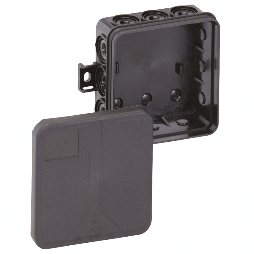 Spojovací krabice podle DIN EN 60670 (VDE 0606), 12 přívodů, 3 spodní přívody, kompletní s děrovacím nástrojem a zaslepovací zátkou, s vnějšími místy připojení, krytí IP55, do 2,52, s pevností IK07, třída ochrany II, VDE zkouška, bez halogenů, 85 x 85 x 37 mm, černá, bez svorek, pro samostatné svorky s certif. VDE.