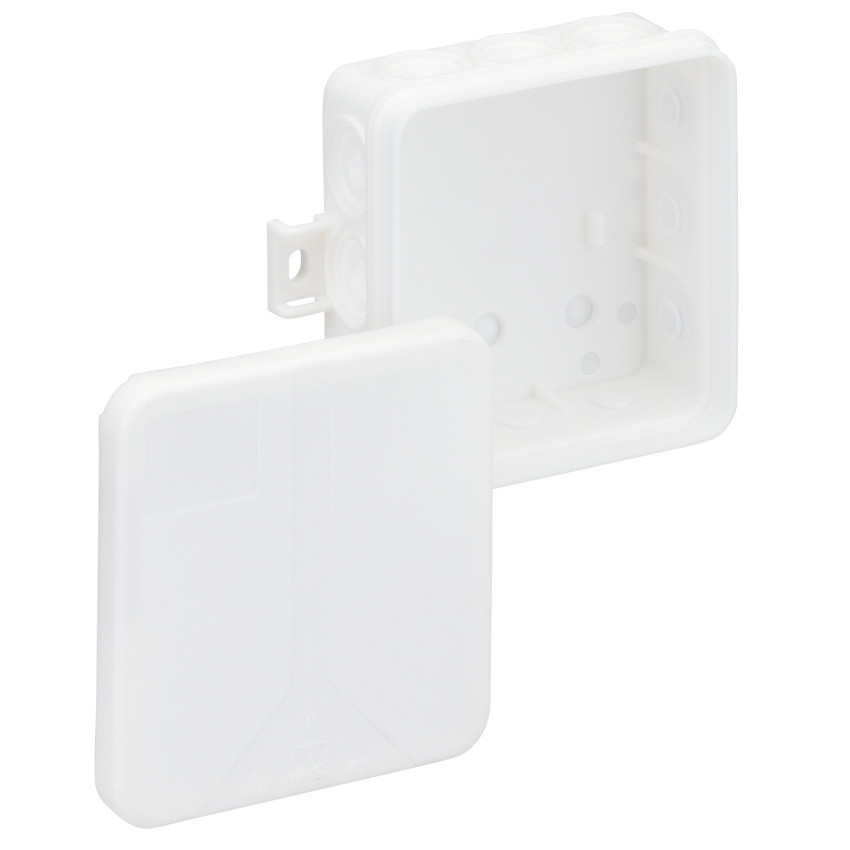 Spojovací krabice podle DIN EN 60670 (VDE 0606), 12 přívodů, 3 spodní přívody, kompletní s děrovacím nástrojem a zaslepovací zátkou, s vnějšími místy připojení, krytí IP55, do 2,52, s pevností IK07, třída ochrany II, VDE zkouška, bez halogenů, měrné izolační napětí Ui 400V, 85 x 85 x 37 mm, bílá, bez svorek, pro samostatné svorky s certif. VDE.