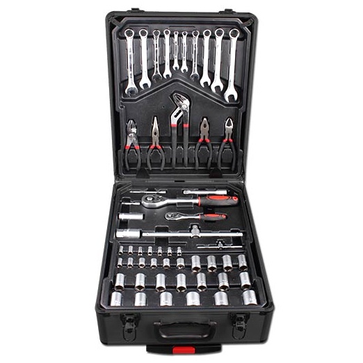 Sada 188 dílů nářadí v hliníkovém kufru na kolečkách. Nářadí uloženo na plastových platech s prolisy pro každý kus zvlášť, což zabraňuje smíchání a vysypání nářadí při převozu.