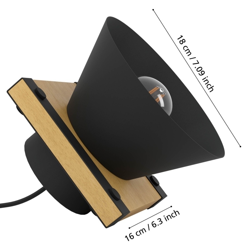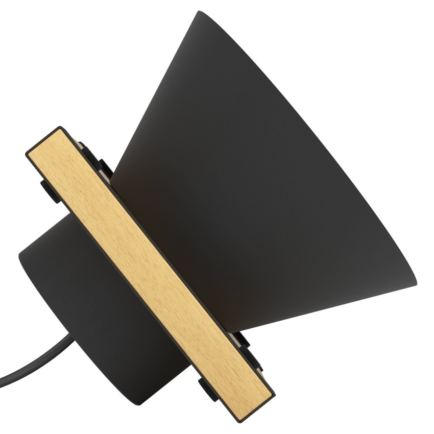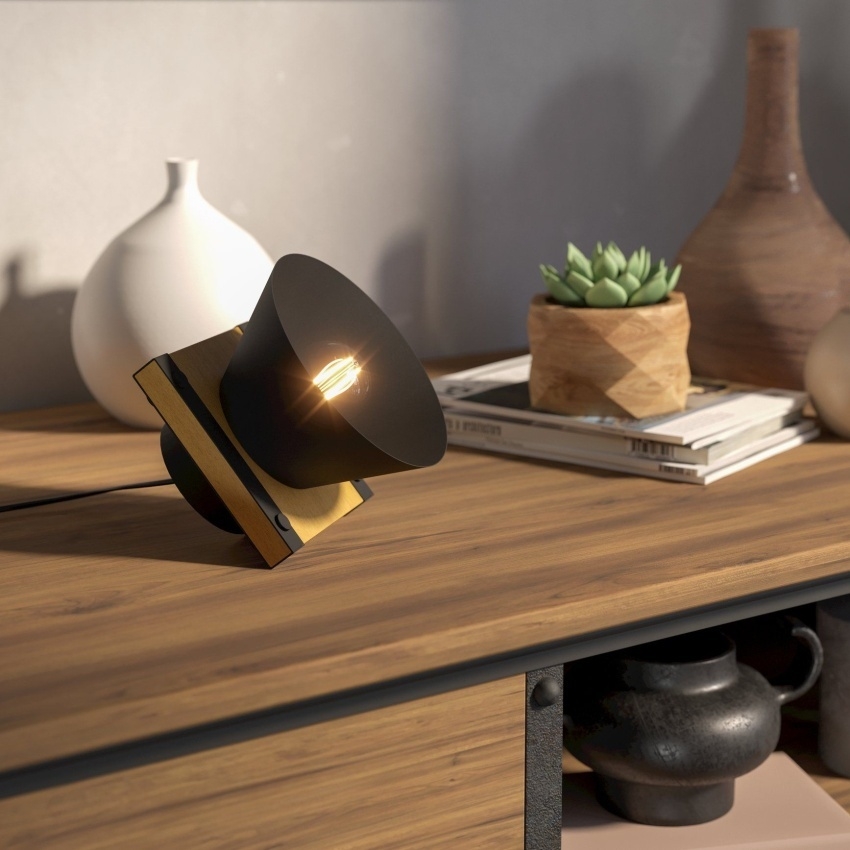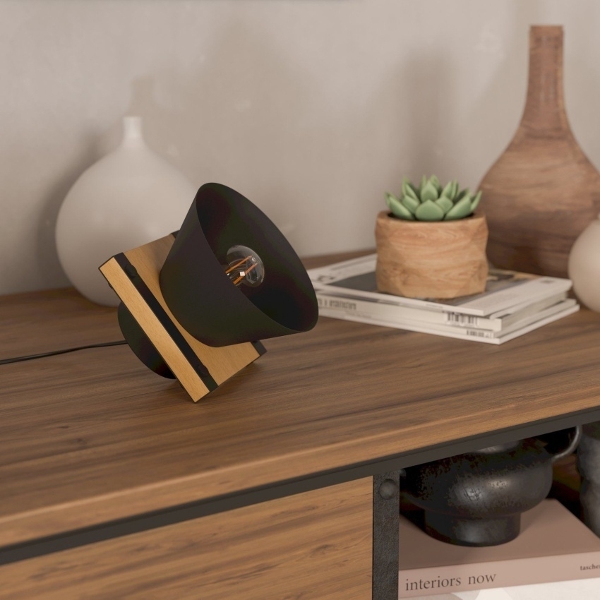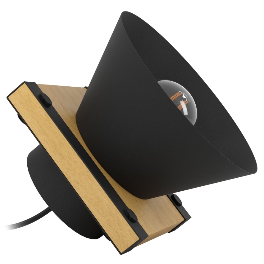 Stolní svítidlo EGLO MACCLES 43959 s moderním industriálním designem kombinujícím černý kov a přírodní dřevo, ideální jako stylový doplněk interiéru.