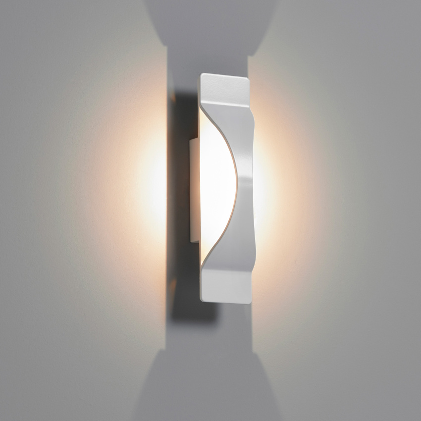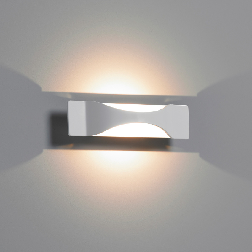 Ambientní dekorativní Wave LED obdélníkové svislé nástěnné světlo s přímým / nepřímým osvětlením, které poskytuje měkký světelný efekt, teplotu 2700 K jantarové bílé barvy, bílé hliníkové tělo a integrovaný ovladač LED (nestmívatelný), 211 lumenů, 6W, 35lm / W, 2700K, IP20, RAL 9003, 30 000 hodin