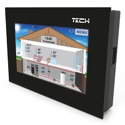 Pokojový termostat EU-281 s RS komunikací umožňuje pohodlné ovládání a kontrolu pokojové teploty, teploty kotle (ÚT), bojleru (TUV) a směšovacích ventilů přímo z bytu bez nutnosti vstupu do kotelny. Termostat spolupracuje s většinou regulátorů firmy TECH vybavených komunikací RS (standardní, pro kotle na pelety se zapalovačem, pro instalace). Velký, barevný, dotykový displej umožňuje pohodlné ovládání a nastavování parametrů termostatu.