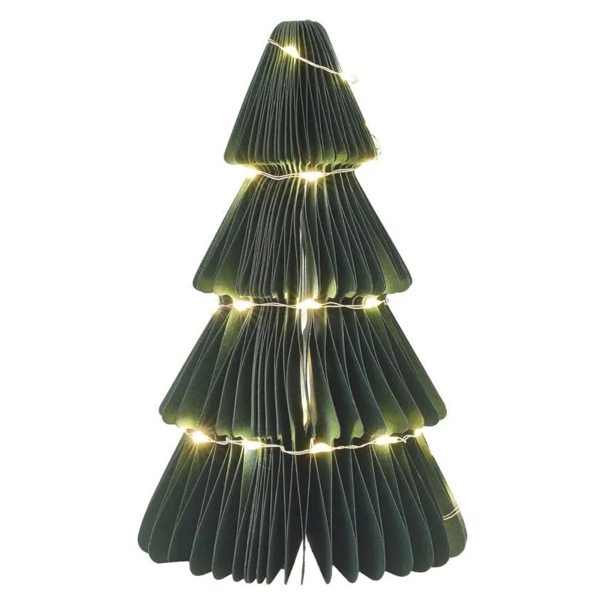 Vánoční papírový stromek s LED osvětlením je stylová interiérová dekorace s teplým bílým světlem.