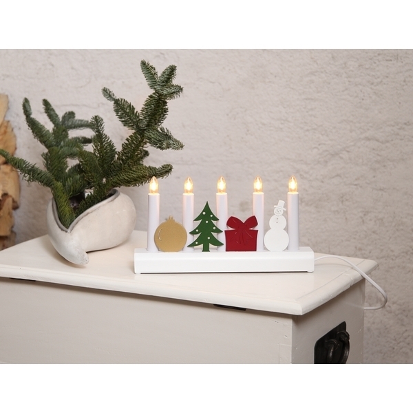 Vánoční zdobený svícen Julia - 5 světel Bílý broušený svícen Julia s barevnými symboly Vánoc a zimy, koule na vánoční stromeček, jedle, dárek a sněhulák ladí téměř s každým moderním stylem vybavení a je ideálním způsobem, jak se naladit na vánoční týdny.