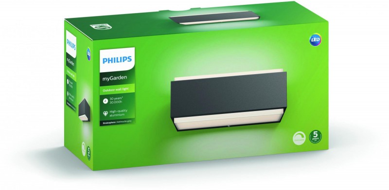 Nástěnné svítidlo Stratosphere z kolekce moderního osvětlení značky Philips dokonale osvítí exteriér Vašeho domu, chaty či garáže a díky svému originálnímu designu zaujme každou Vaši návštěvu. Krytí IP44 jej chrání před stříkající vodou. Tělo svítidla o rozměrech 7,6 x 20,3 x 9,3 cm je zhotoveno z odolného litého hliníku s antracitovou povrchovou úpravou doplněnou o bílý plastový difuzor. Svit zajišťuje integrovaný LED zdroj o příkonu 2 x 4,5 W s celkovou svítivostí až 1000 lm a teplotou chromatičnosti 4000 K. Svítidlo je určeno k napájení ze sítě na 220-240 V